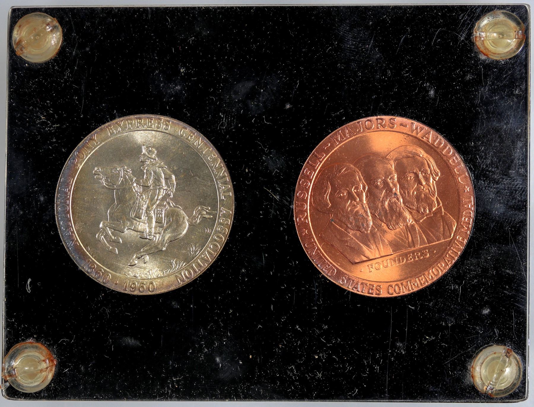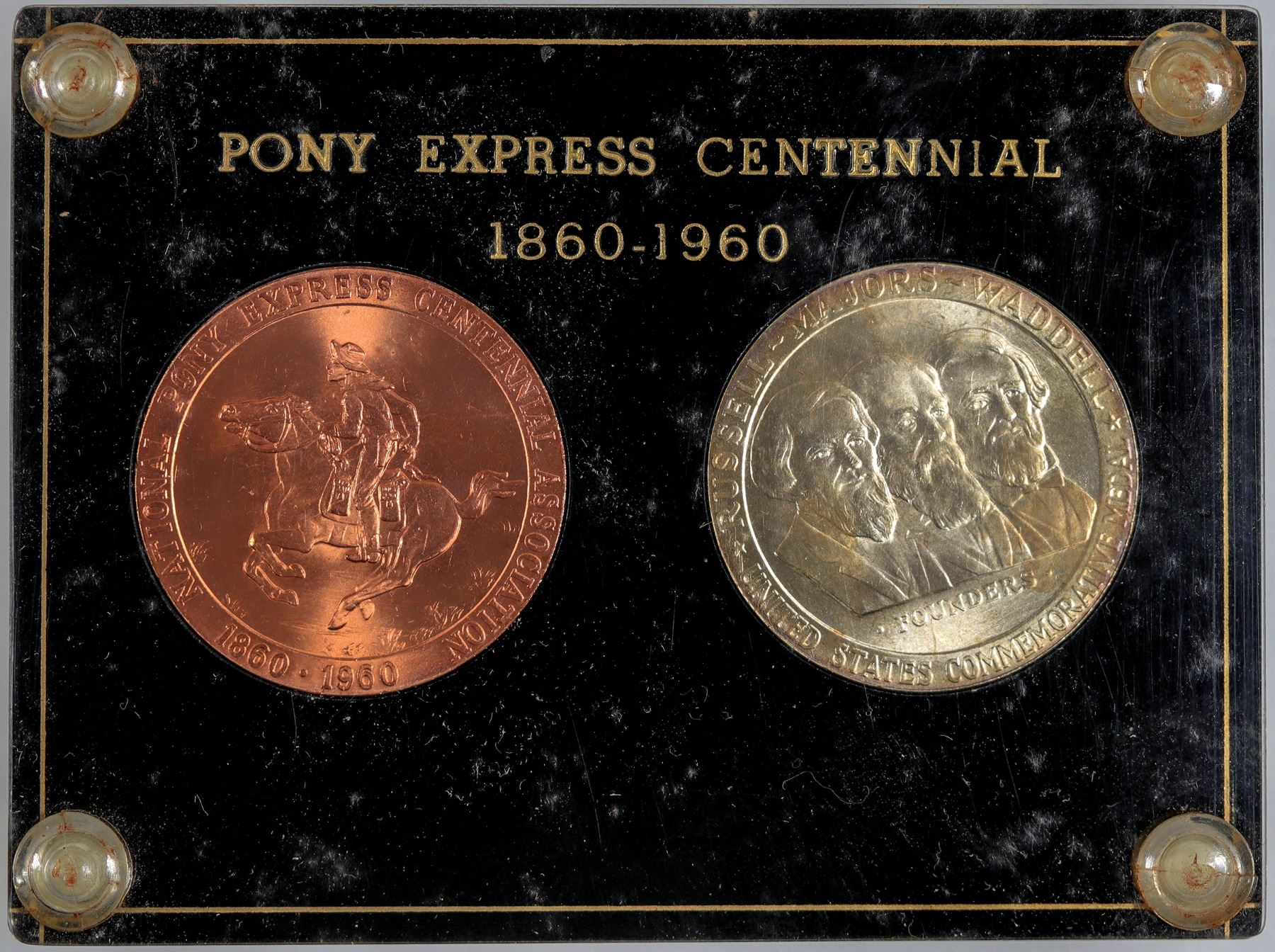 Rare! Capital plastics case with two Pony Express Centennial 1860-1960 medals: bronze and silver. Russell, Majors and Waddell on one side, a pony express rider on the reverse. Case is 4 x 3 inches, medals are 34 mm. california