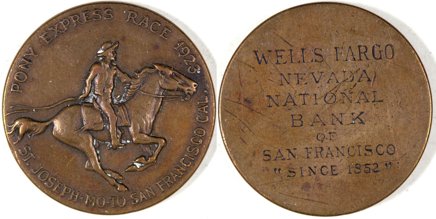 Obv.: Pony Express Race 1923 / horse and rider / St. Joseph to San Francisco; Rev.: Wells Fargo / Nevada / National / Bank / of / San Francisco /"Since 1852". Rd., br., 24 mm. Rare, original condition.
