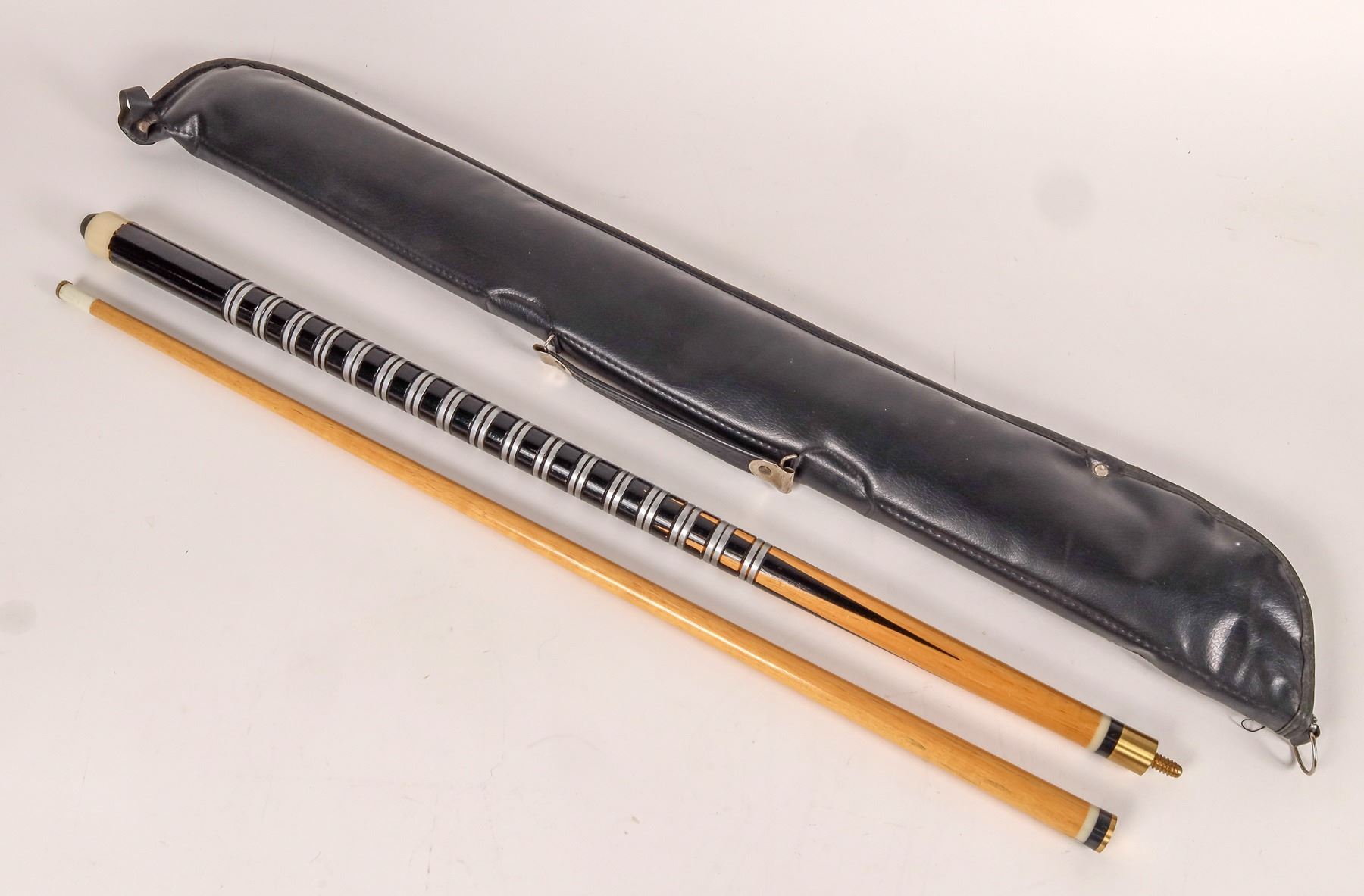 This 57 in. pool cue is not marked but well made. It is 2-piece North American Maple, 13 mm tip, black/white spacers, with carry case. Only lightly used, very good condition.