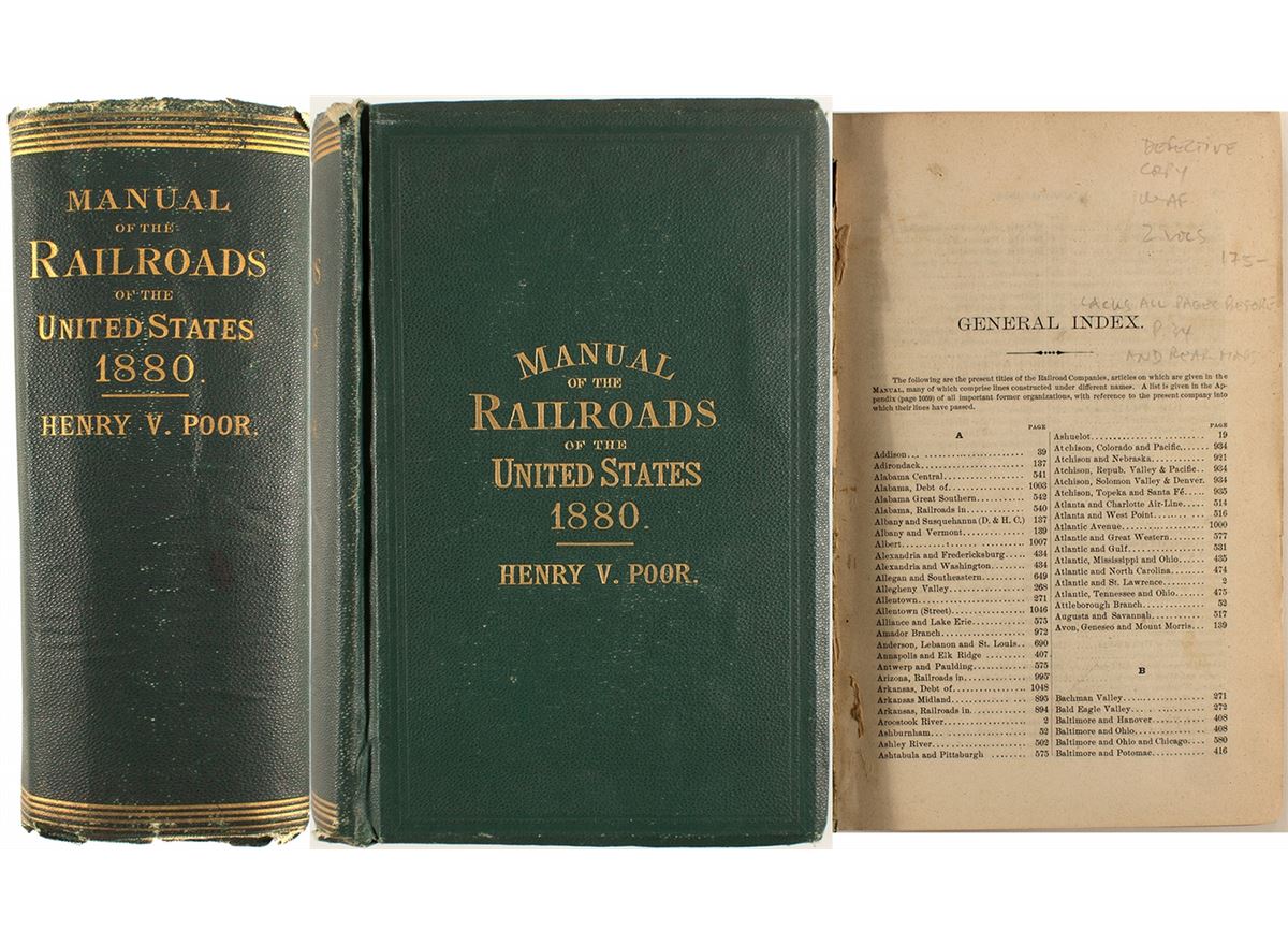 This is a list of "all the railways in North America and of the leading organizations auxiliary to the Railway System. Lists of Officers of South American and Hawaiian Railways.” Compiled from official information from Poor's Railroad Manual. 1070 pages. The front and back covers are very loose. There are no other listing of this edition in OCLC. Rarity: [i].