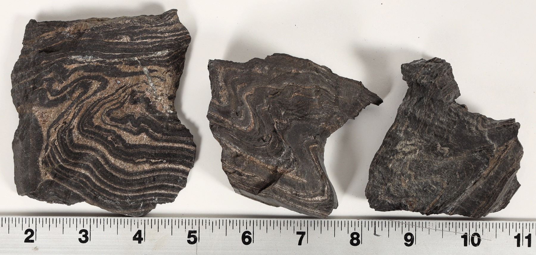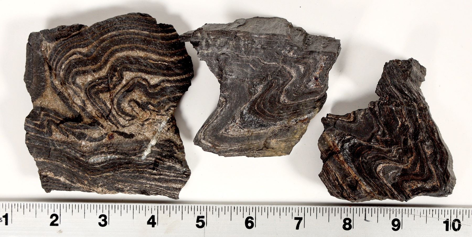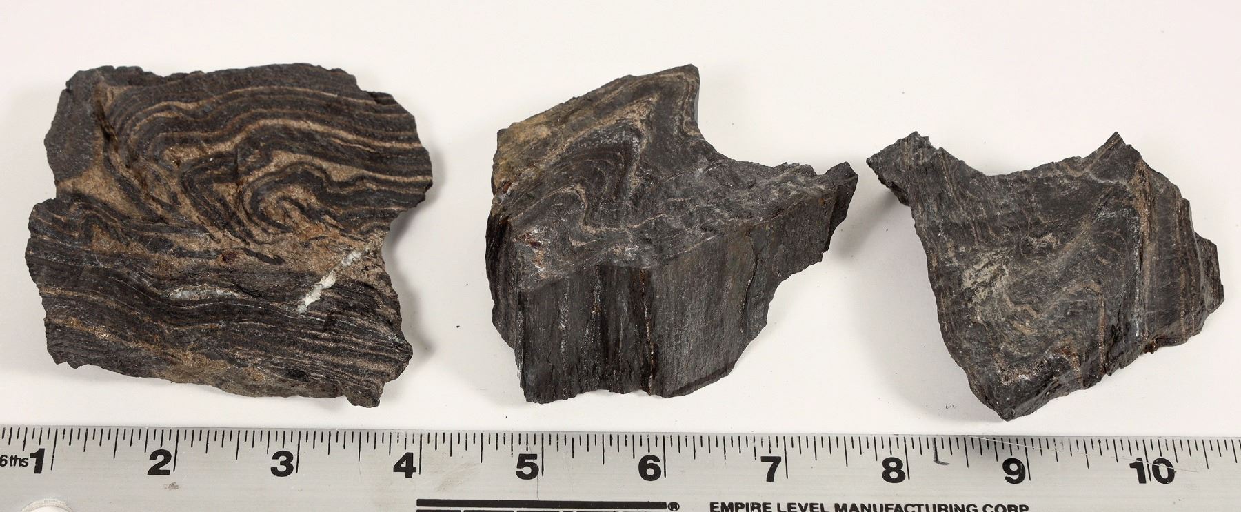 Three specimens of the Poorman Formation at Homestake showing pyrite mineralization inside of the folds. Spectacular! Please see photos for dimensions. The Poorman Formation underlies the Homestake Formation and is composed of an upper sequence of sericite to biotite-dominant carbonate quartz and graphitic phyllites and a lower sequence of hornblende-plagioclase schist of tholeiitic affinity. Shows intense folding.
