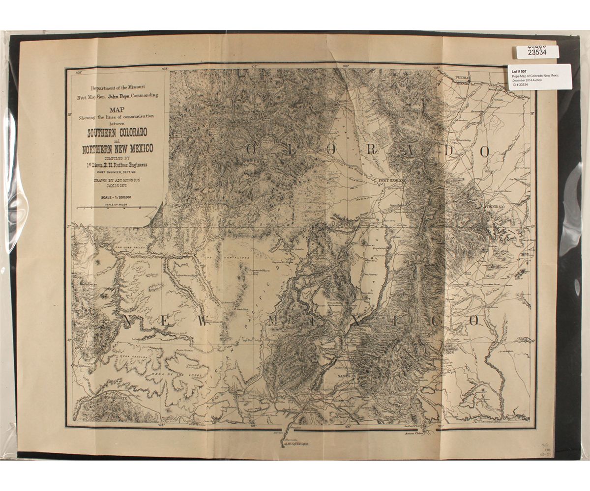 Shaded relief map from Pope's expedition defining the line between Colorado and New Mexico, compiled by E.H. Ruffner, drawn by A. Hunnis, Jan 1, 1876. 20 x 16", printed on very thin paper, and professionally backed by rice paper. Fort Wingate at lower left, Pueblo at upper right, Fort Union near lower right. Folded, with tear at top center, unrepaired. Choice content.