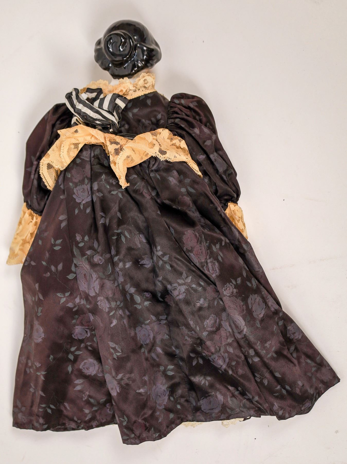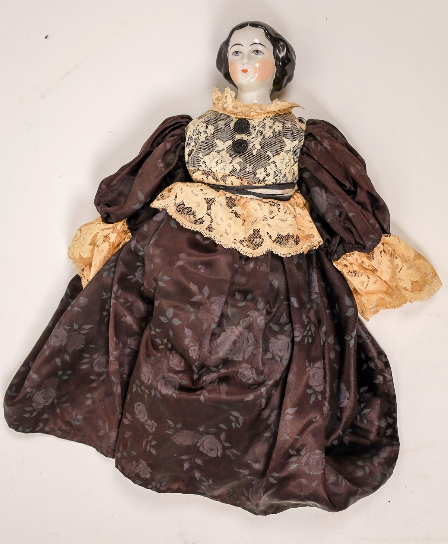 This beautiful doll stands 16 in. tall and wears a porcelain head, arms, and legs. All porcelain is in excellent condition and without blemishes. The body is stamped "Body Made by Ruth McClanahan" across the back c. 1880. The dress is a dark lavender rose pattern with lace and the body is stuffed fabric. The undergarments include pantaloons, a petticoat, slip, and dress. A beautiful doll to enjoy.