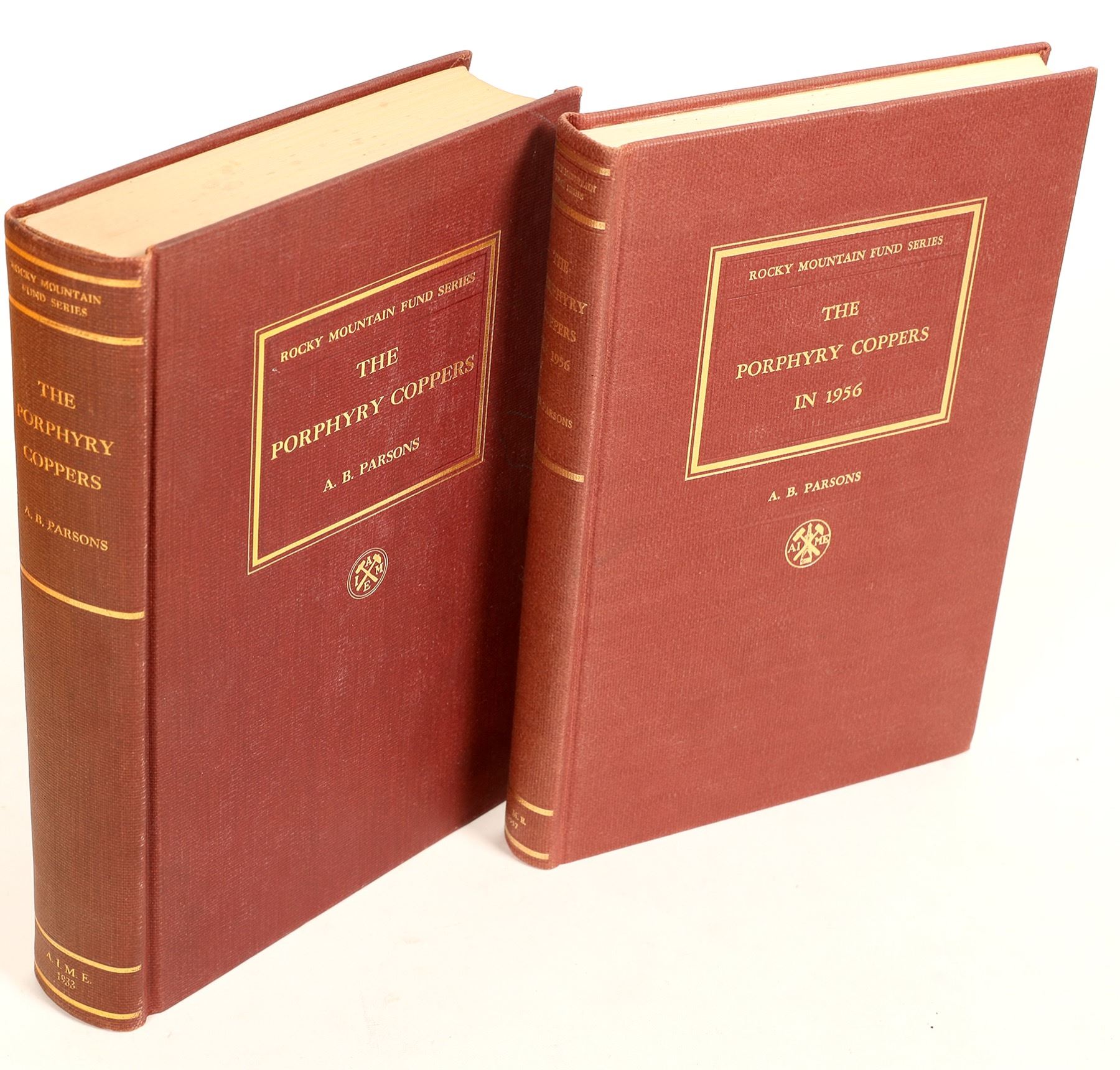 Pair of books from the Rocky Mountain Fund Series, "The Porphyry Coppers," and "The Porphyry Coppers in 1956," both by A.B. Parsons, secretary of American Institute of Mining and Metallurgical Engineers, c1933 (581 pp.) and 1957 (270 pp.), respectively. Both first edition. Published by The American Institute of Mining, Metallurgical, and Petroleum Engineers. Hardcover, cloth bound, embossed gold gilt. Light pencil markings, otherwise clean.[