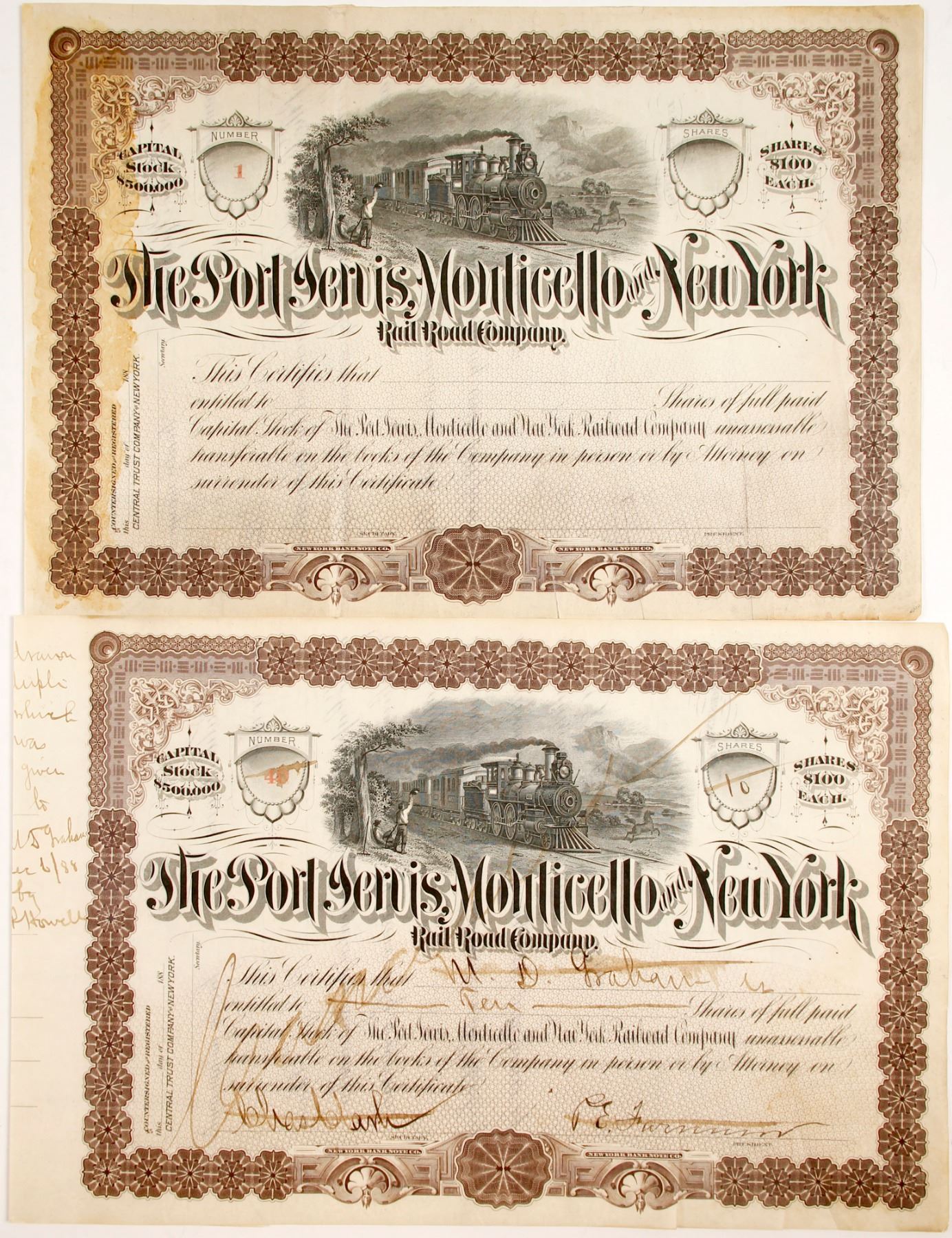 Unissued/cancelled #1,left toning, rear taped cancel cuts. I/C #40 M Graham 10 shares 1886 signed by President illegible. 2 cancel cuts. "Leaving New York by the Erie R. R. from West Twenty-third Street, or Chambers Street, Port Jervis is reached quickly, almost before the distance traveled is realized. The P. J., M. & N. Y. R. R. connects with the Erie R. R. here. Pullmans run on the midday and through coaches on the evening trains. The road has been newly tied, ballasted, and entirely overhauled, and is now in first-class order. New engines, and new passenger coaches. The public can rely upon a first-class service and quick transportation, with no delays. Sunday trains are run. The schedules of daily trains are so arranged, that patrons can leave on the daily morning train from any of the places on this road and reach New York at 10.30 A. M. Good fishing and hunting. Beautiful scenery. Good hotels, cool nights, and no mosquitoes; every night necessitating a blanket. No chills. Our high altitude is a sure cure for insomnia." from usgenweb.info. Ken Prag Collection