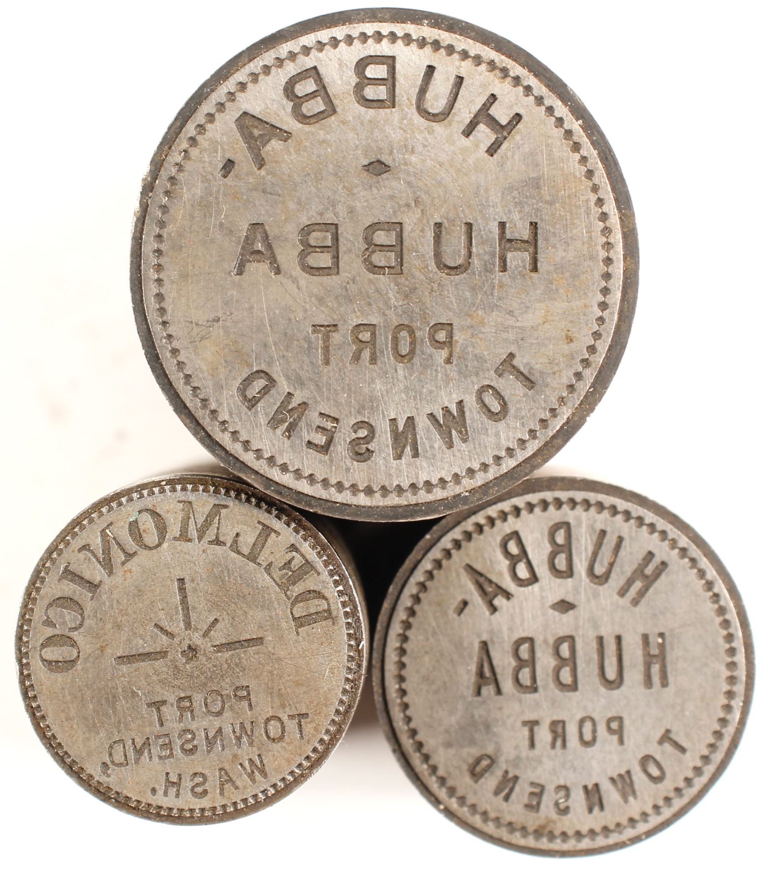 3 token dies self identified from Port Townsend, WA. 21mm: Delmonico. 24mm: Hubba-Hubba. 30mm: hubba_Hubba. Northwest Territorial Mint Historical Die Collection State: Washington City: Port Townsend Date: c1903-1950 HWAC# 85022