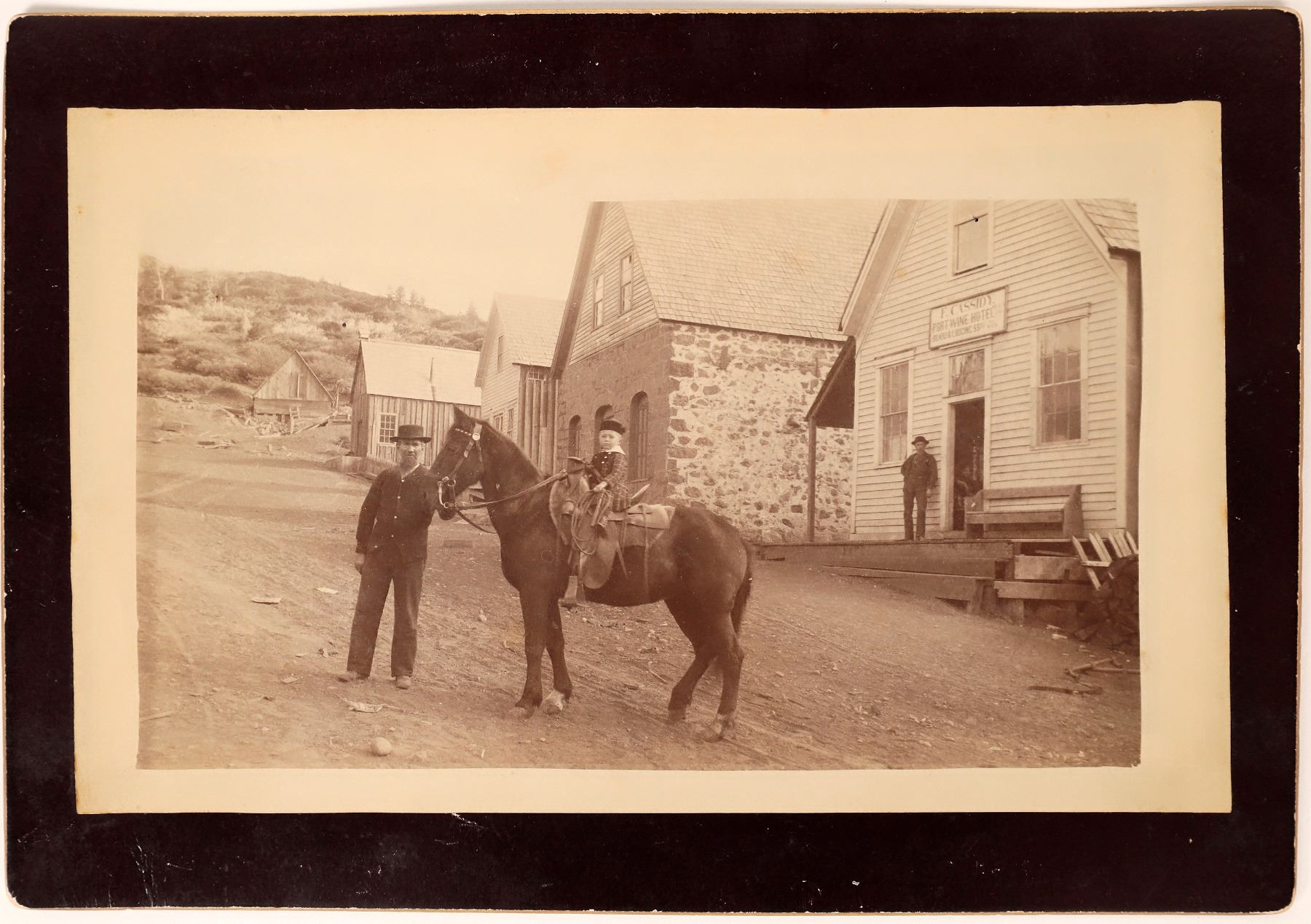 Original 5.75x8.75" photo of Felix Cassidy and horse with Henry Masson on top. This photo is on page 217 in Garvis book. This is Main St. in Port Wine c. 1890 prior to hydraulic mining which "piped" away this side of Main St. Building. Left to right-Felix Cassidy's Hotel, Henry Mason Store, Liberty Hotel and Saloon, Jim Lewis Hotel and a Chinese residence. From the Garvis Collection. Port Wine California