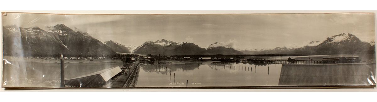 Black and White photograph (unframed, 10" H x 45" W) by H.A. (Heath Arlo) Ives. The photo depicts two wooden bridges and small dam over the water; mountains in background in Valdez, AK. Valdez is located near the head of a deep fjord in the Prince William Sound in Alaska.