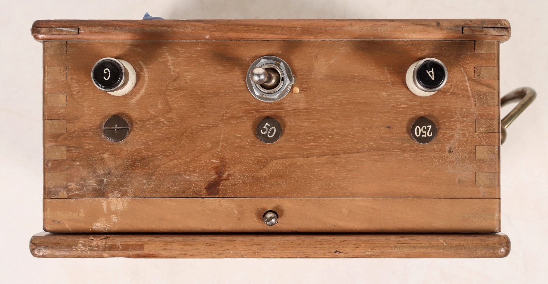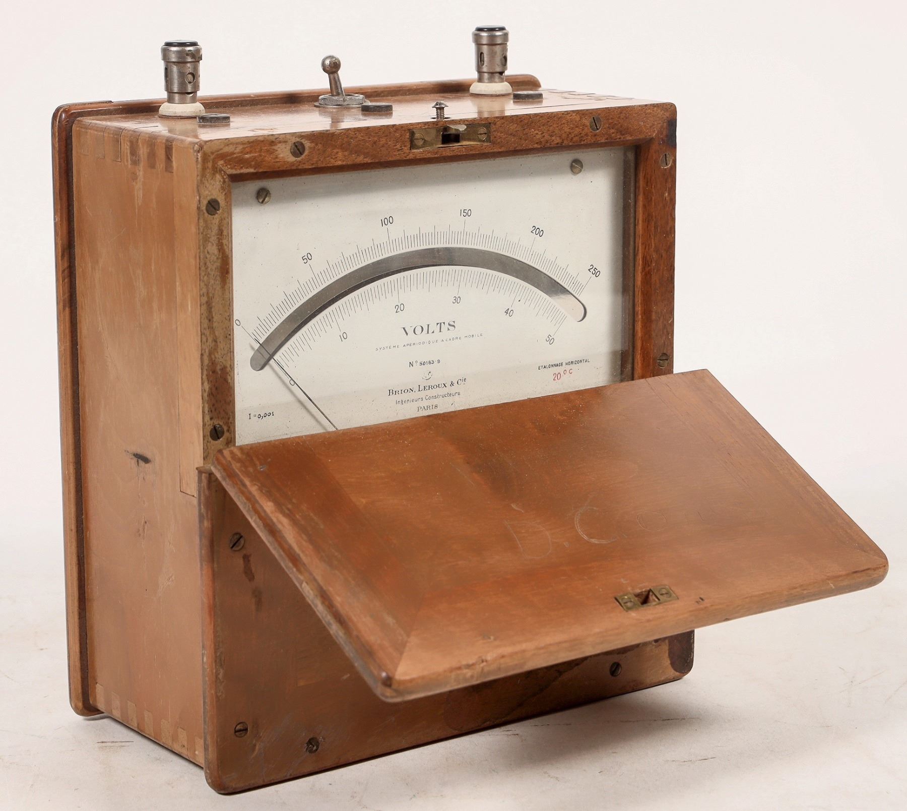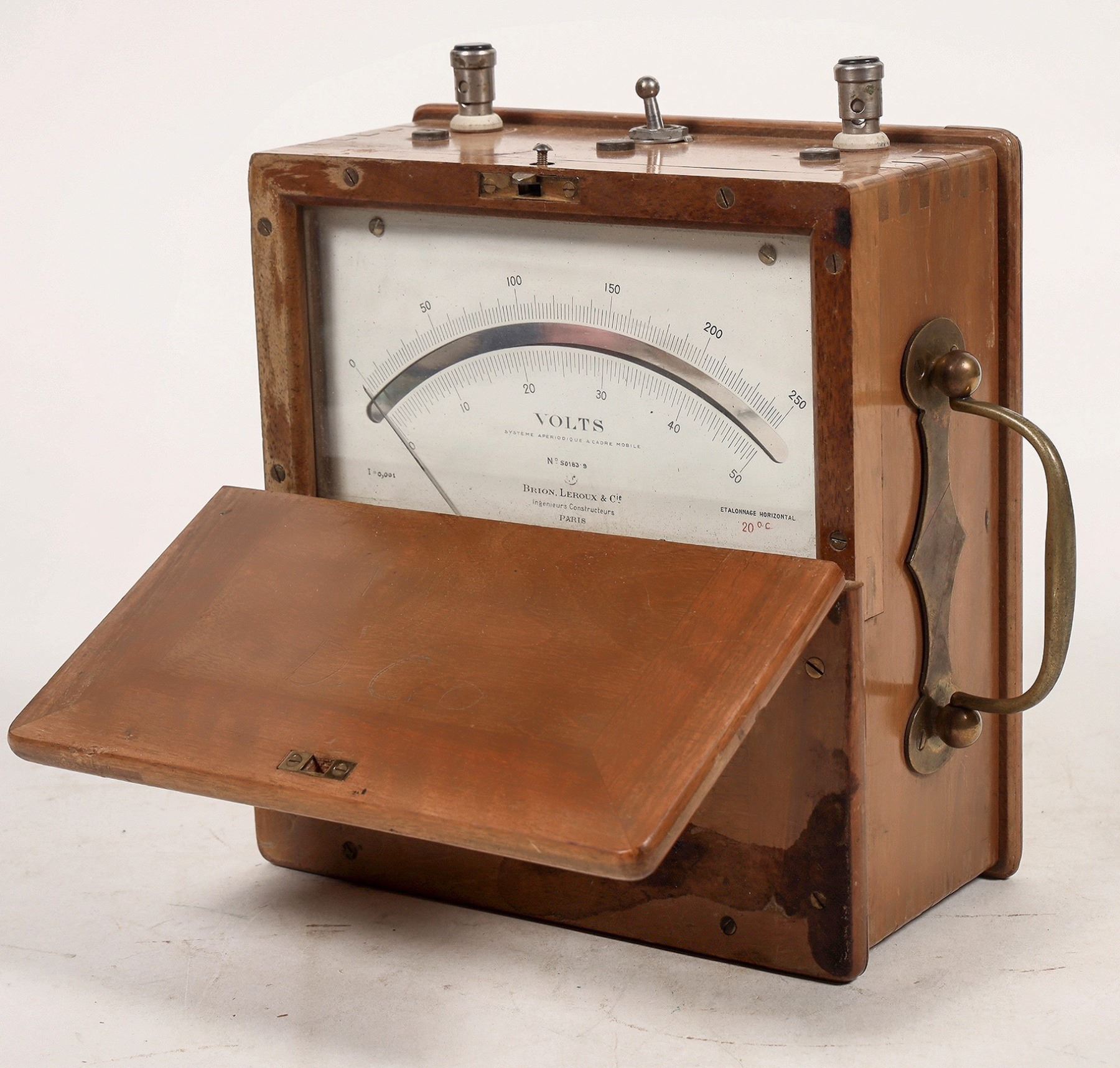A portable volt meter made in France. Measures 4"x 7.5"x 7.5" and appears to be in decent condition, although it's not been tested. It's contained in a wooden box with a metal handle. Please see photos for more details.