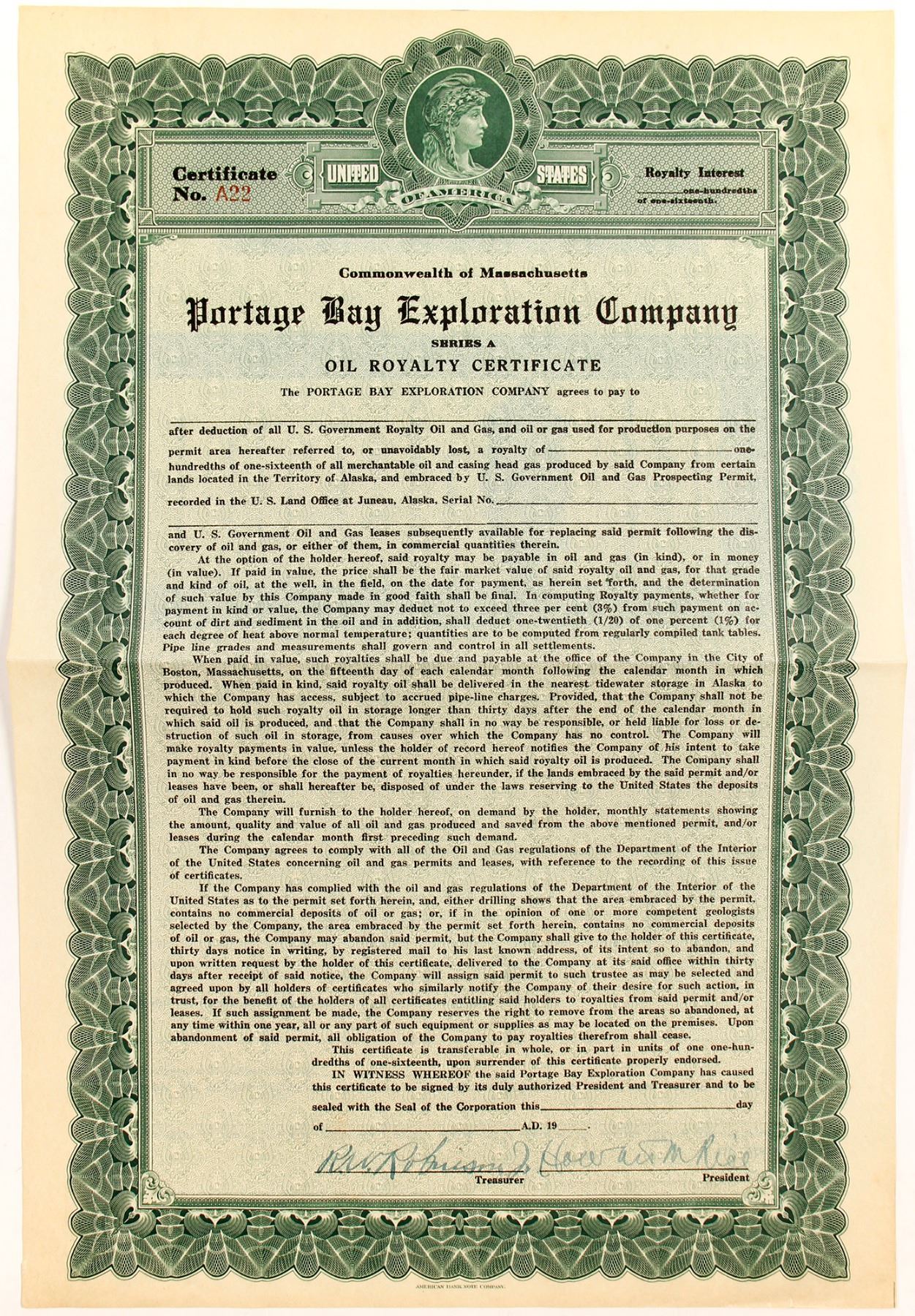 Portage Bay Exploration Company Oil Royalty Certificate Series A, Certificate A22, Series A, signed Howard Rice, president. Vignette: Profile of lady. Printed by American Bank Note Company. Ken Pray Collection.