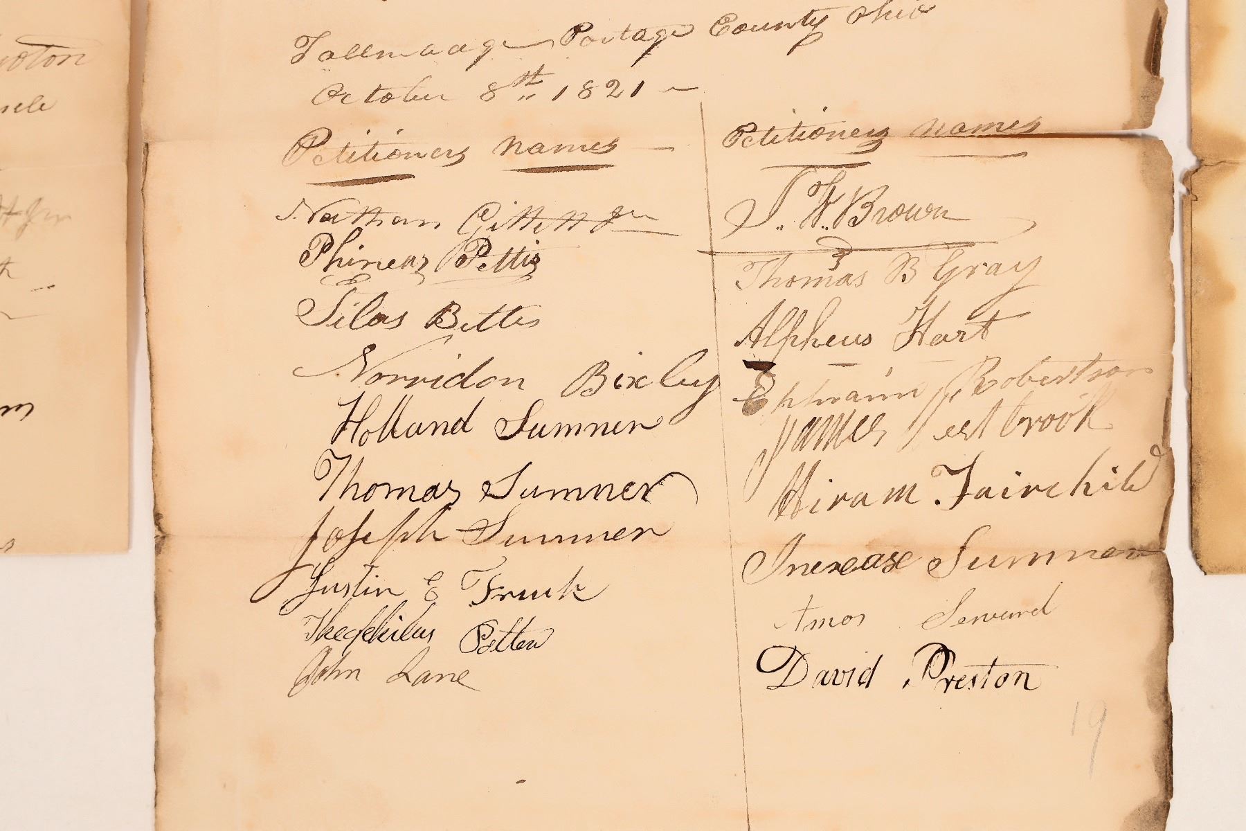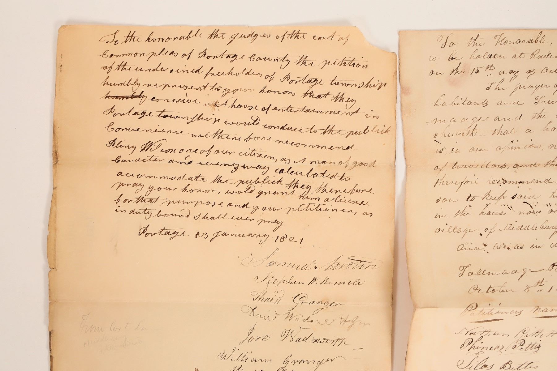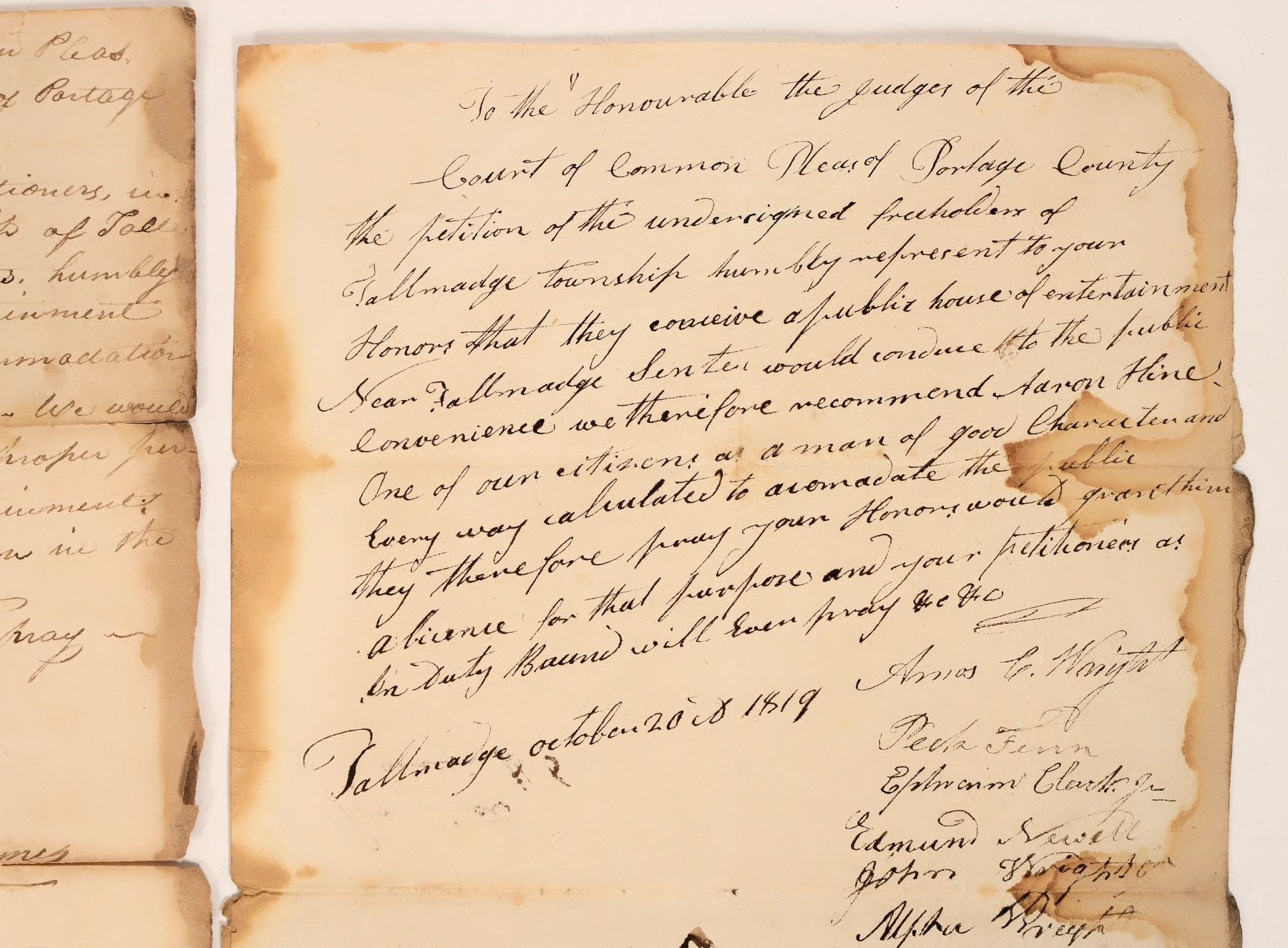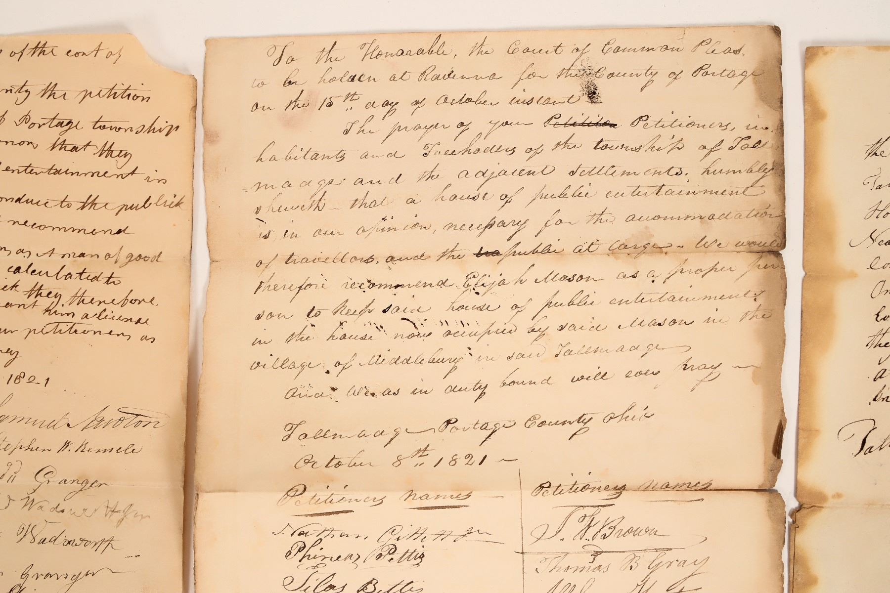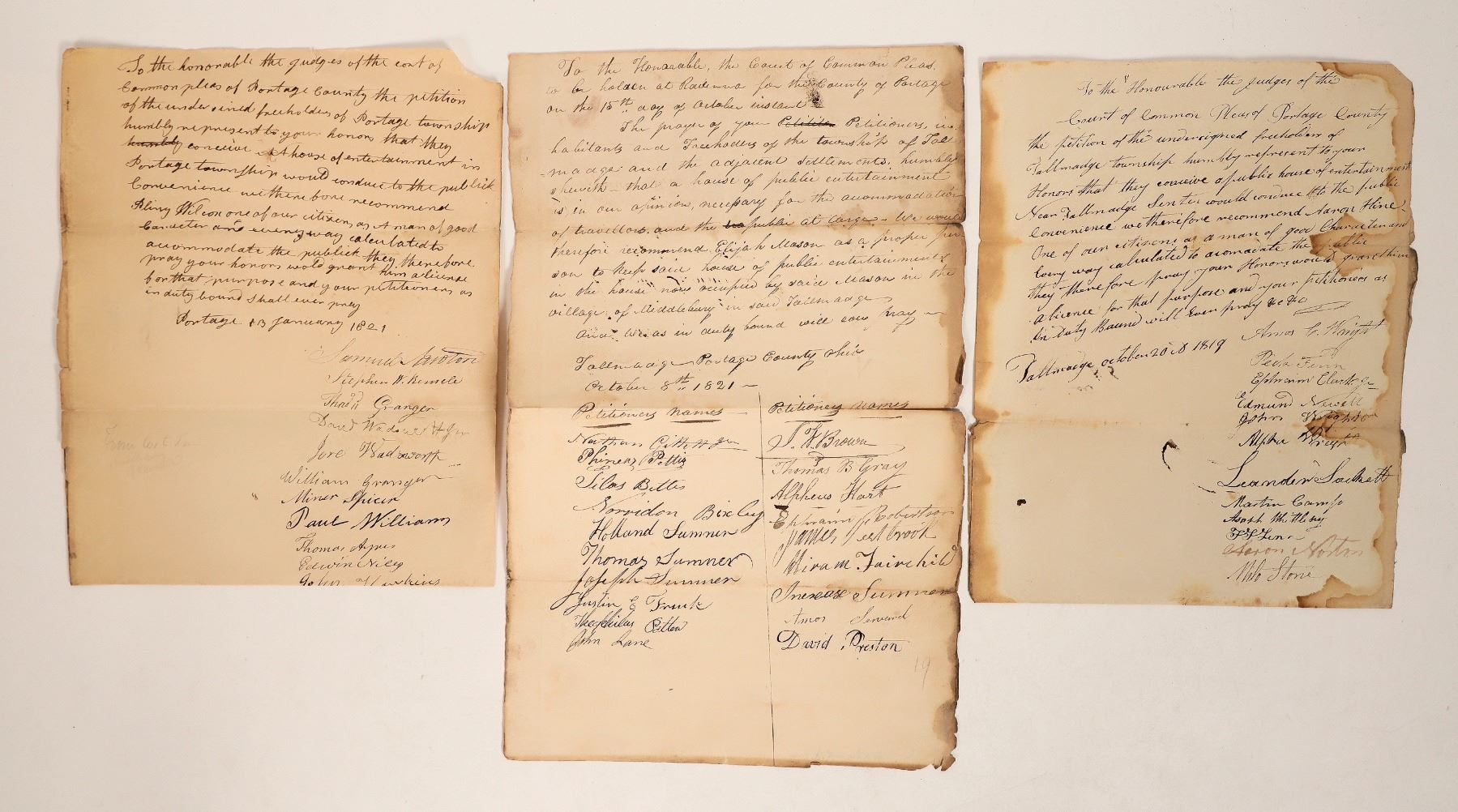 Collection of 3 documents related to liquor/saloons from Portage County, Ohio, c1819-21. Includes 2 liquor licenses, both 8" x 10" and signed by early important people: 1919, Tallmadge, Ohio, signed by names such as Wright, Finn, Clark, Newall, Camp, Linn, Norton, Stone, etc.; and 1821, Portage, signed by Granger, Wadsworth, Spicer, William, Aynes, Niles, Hawkins, etc. Also includes a petition for Elijah Mason to open a saloon "house of public entertainment," in Tallmadge, c1821. Signed by petitioners, including: Pettis, Bixby, Sumner, Frank, Brown, Gray, Hart, Robertson, Westbrook, Fairchild, Preston, etc. About 8" x 13". All 3 documents appear to be in the same handwriting.