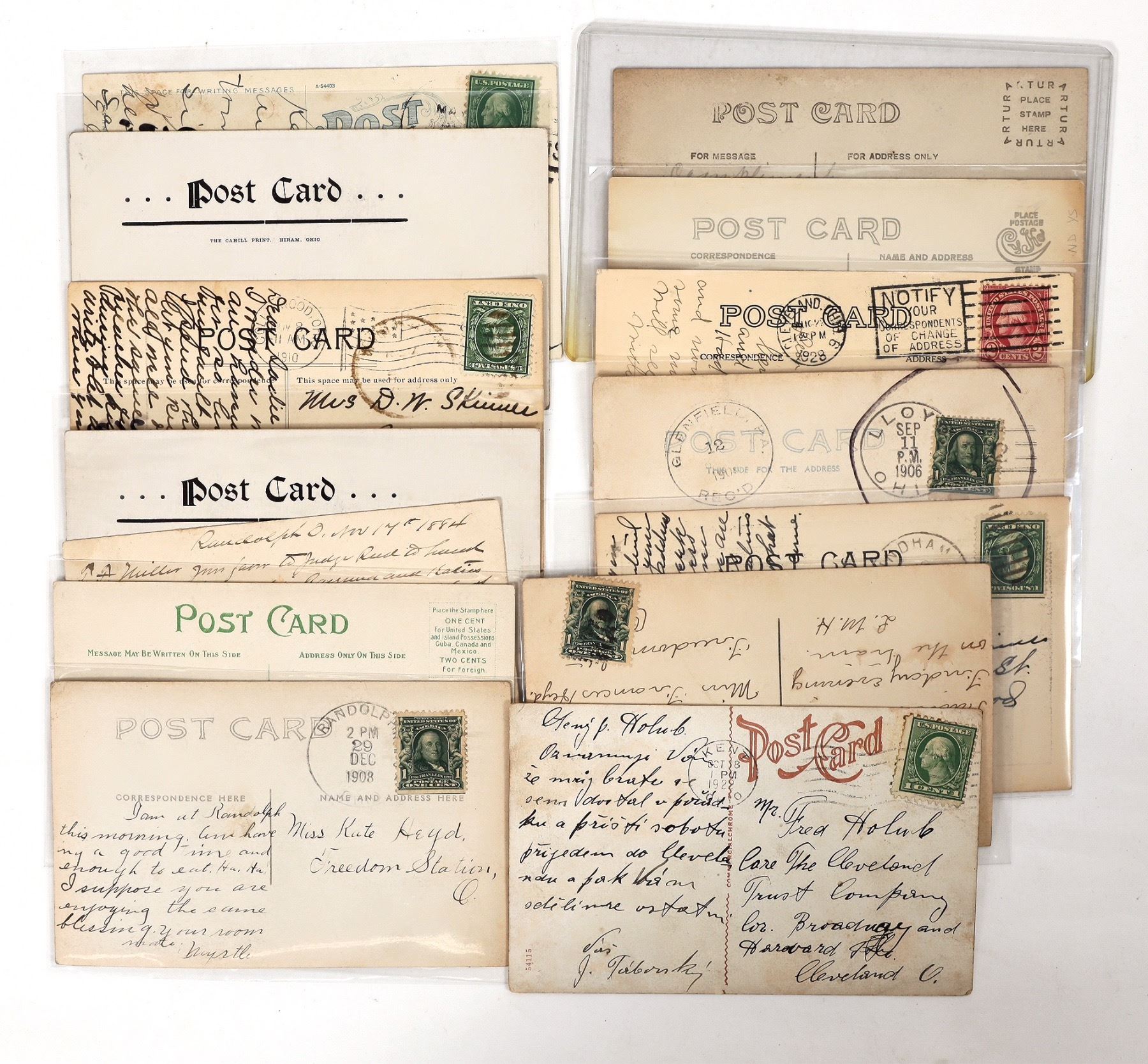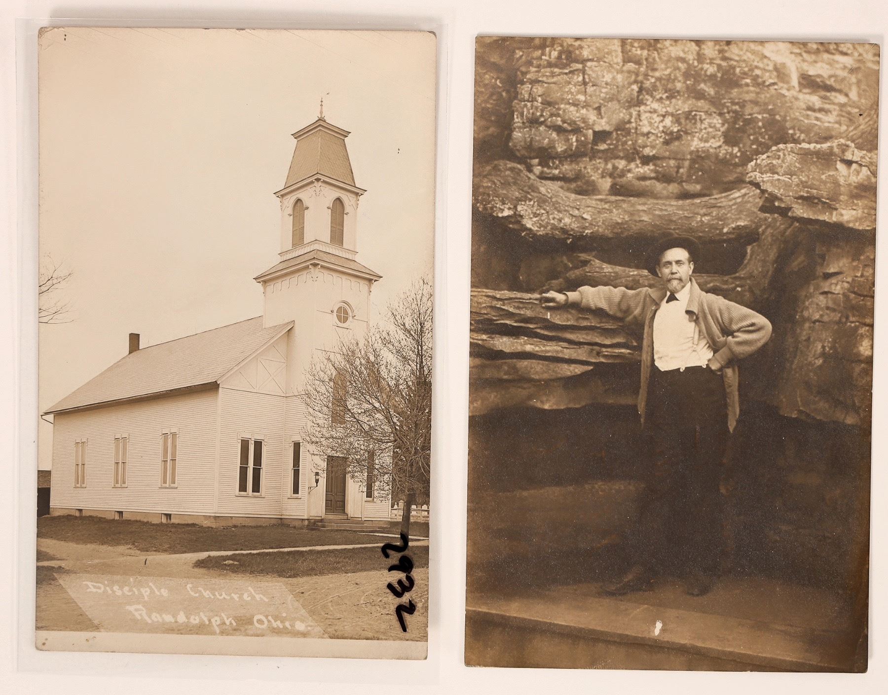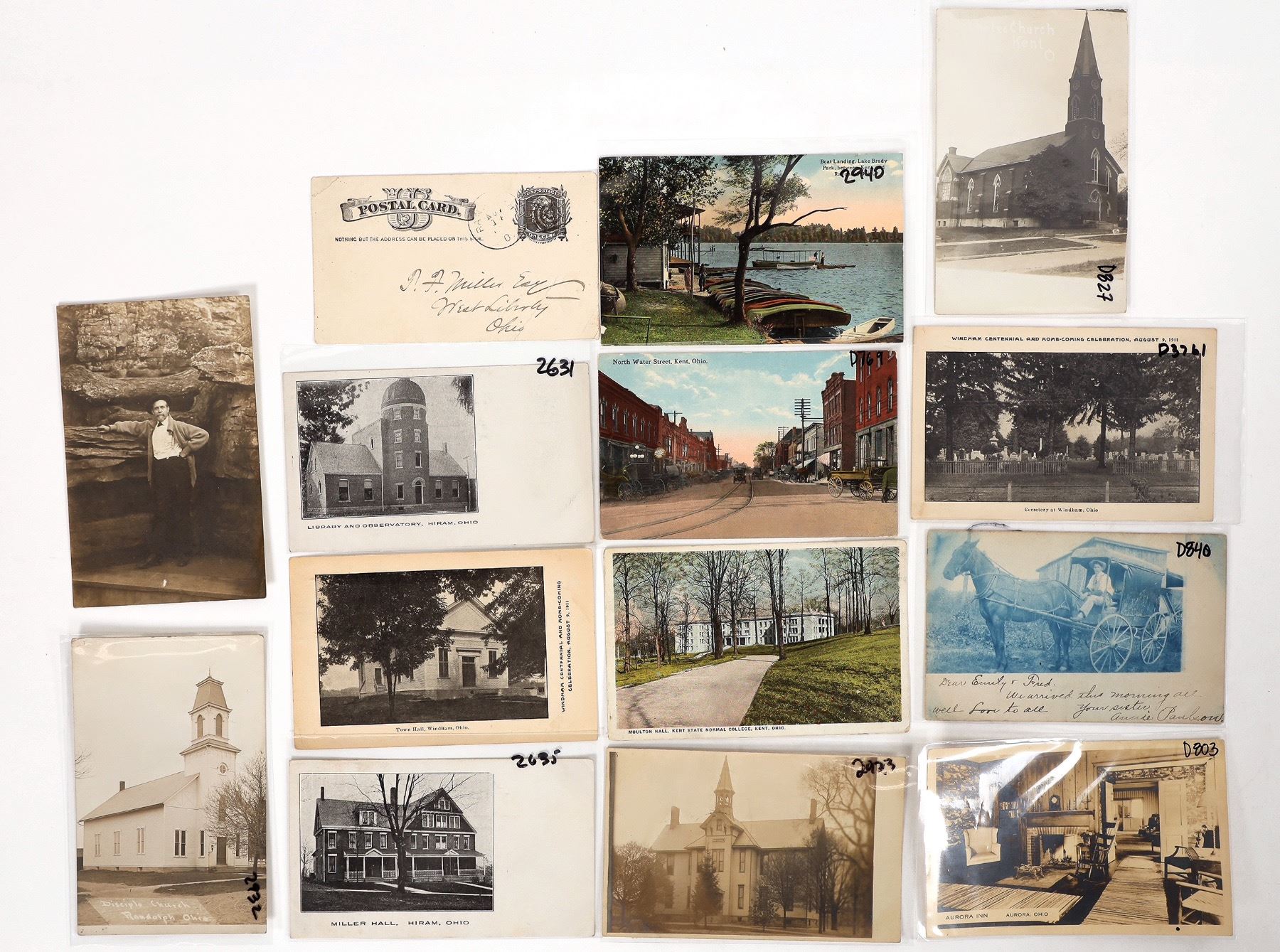 1884-1928 A collection of 13 postcards from Portage County, Ohio, c1884-1928. Includes a pioneer card from Randolph, Ohio, penned date Nov. 17, 1884 on verso, postmark Nov. 18, (year illegible). 6 RPCs. Buildings, street scenes, cemetery at Windham, etc., from the towns of Windham, Lloyd, Kent, Aurora, Randolph, and Hiram.[ Ohio