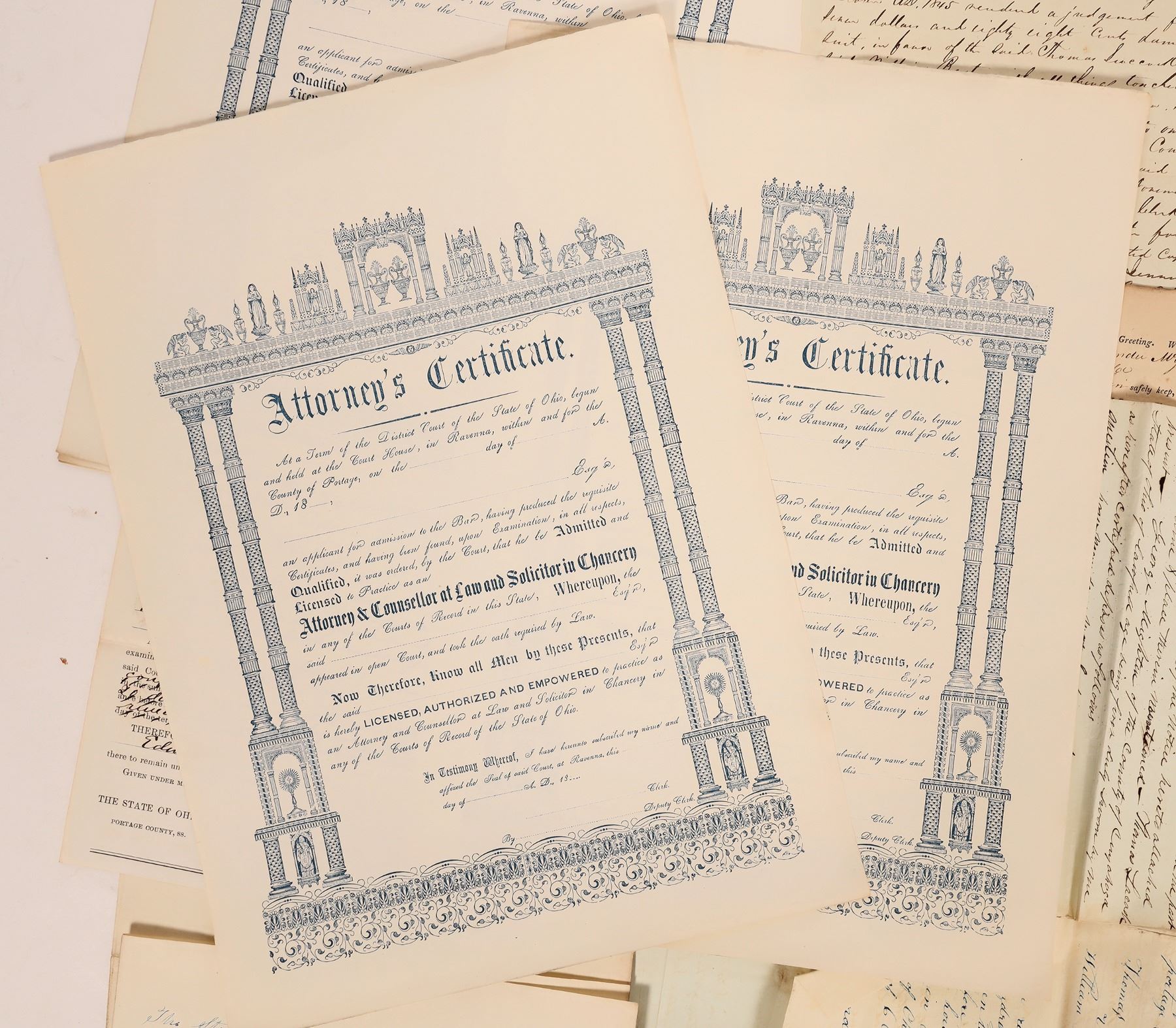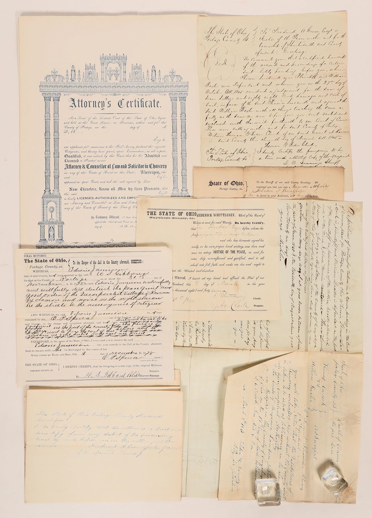 A collection of eight includes court writs & summons from Portage Co., Ohio, c1811-18XX. Includes an 1811 order for Alexander McGreary Johnson to appear in the Court House in the Town of Ravenna, Portage Co. Also, three blank Attorney's Certificates awarded for passing the bar, & more. Please see photo(s) for more details.[ Ohio