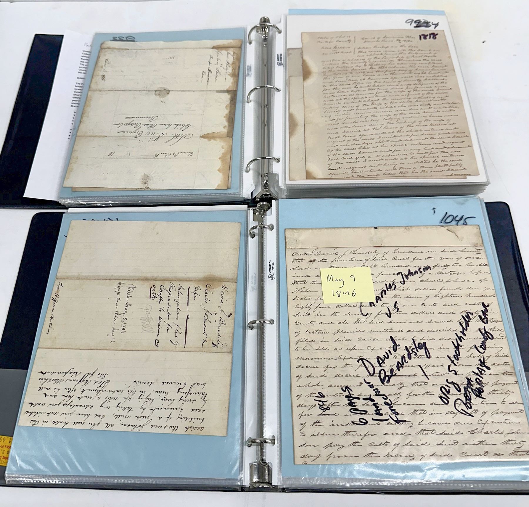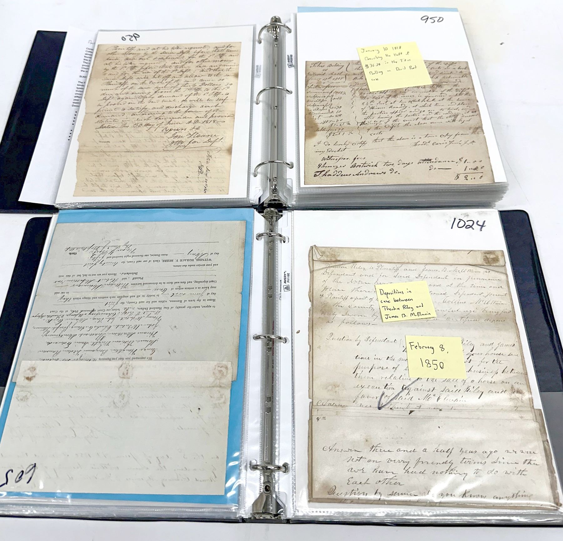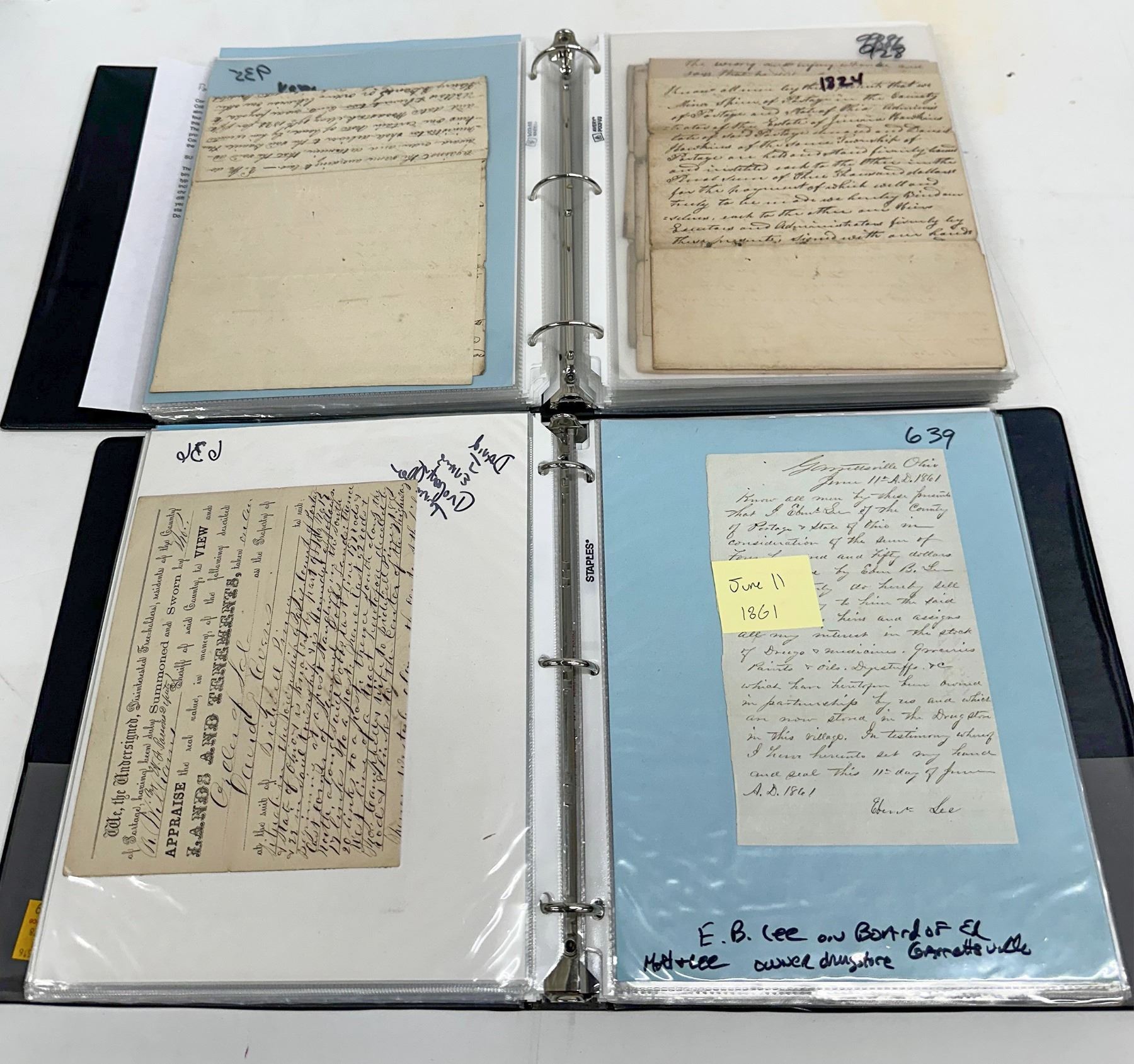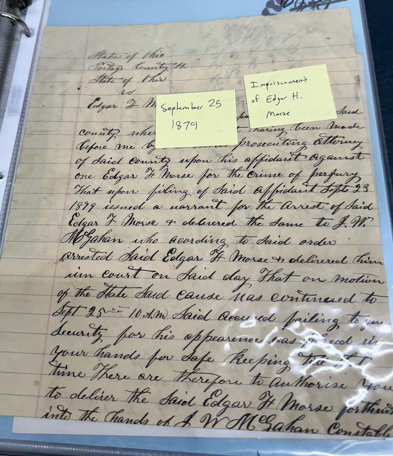 The Portage County Legal Collection consists of over 150 items organized between two binders. The majority of these items are handwritten documents, but numerous mass-produced printed documents with details such as dates and names written in by hand are also included. The dates of these documents range from 1803 to 1886, and they are organized chronologically by year. In some cases, multiple documents from the same court case are from different years; in these cases, the documents are kept grouped together and organized into the year of the earliest document of the group. Most items are labeled with a very brief summary stating what they are.