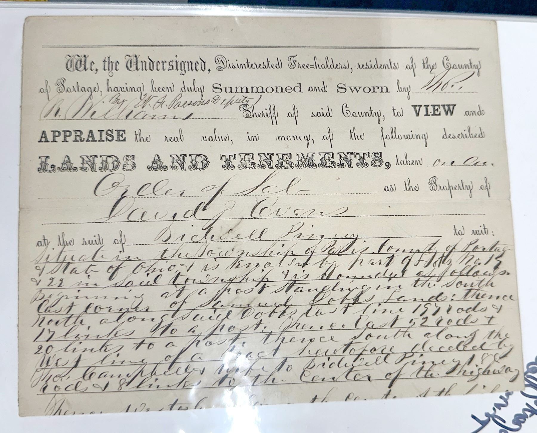 The collection contains a number of documents regarding the sale and ownership of land, providing valuable information on the initial settlement of Portage. Other documents on Portage County's legal history provide a record of the county's early citizens, and paint a vivid picture of the conflict and tension experienced in the county's first eighty years. - JRM