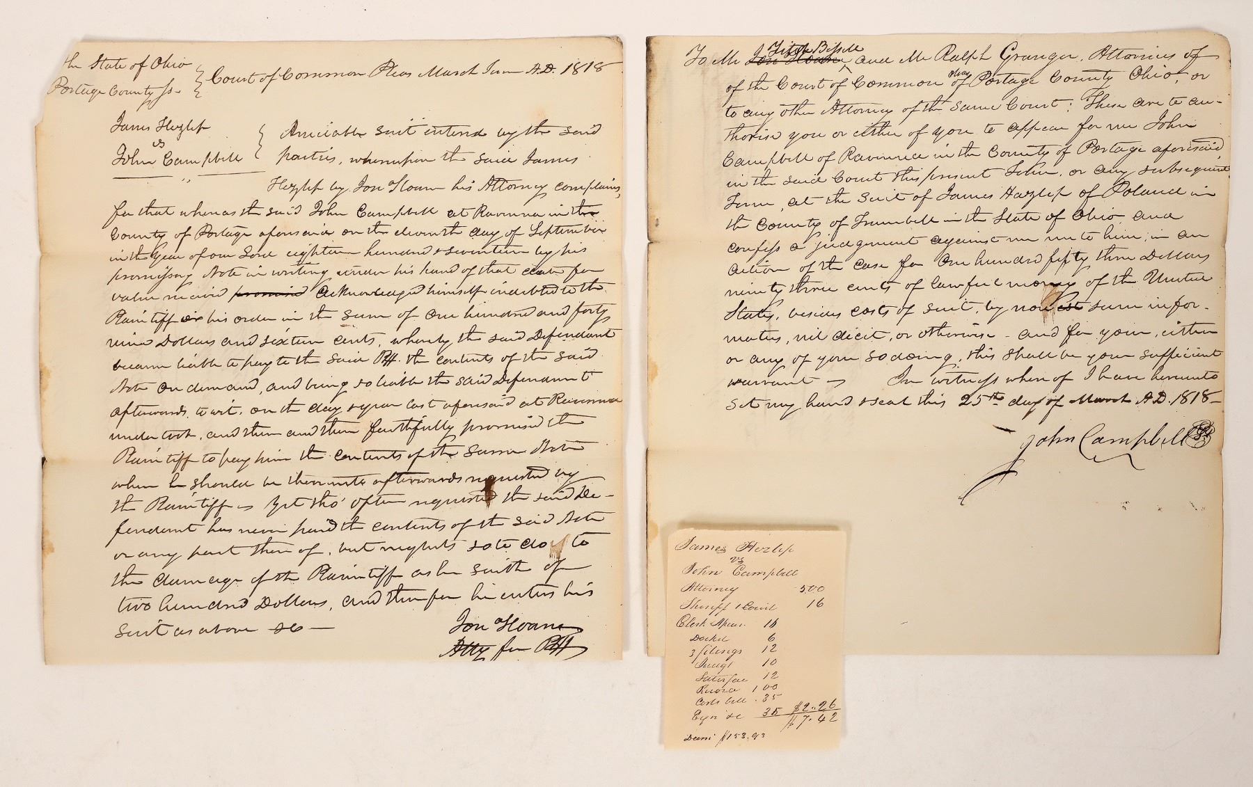 Two documents from the Portage County Court of Common Pleas, written in 1818. The pages document a legal dispute between John Campbell and James Hezlip. Campbell was one of the first permanent settlers of Portage County; the book 'History of Portage County, Ohio' by R.C. Brown and J.E. Norris describes the journey that Campbell and his companions made on foot from Connecticut to Ohio in 1800. According to these historians, he "remained throughout his life one of the leading citizens of the county".