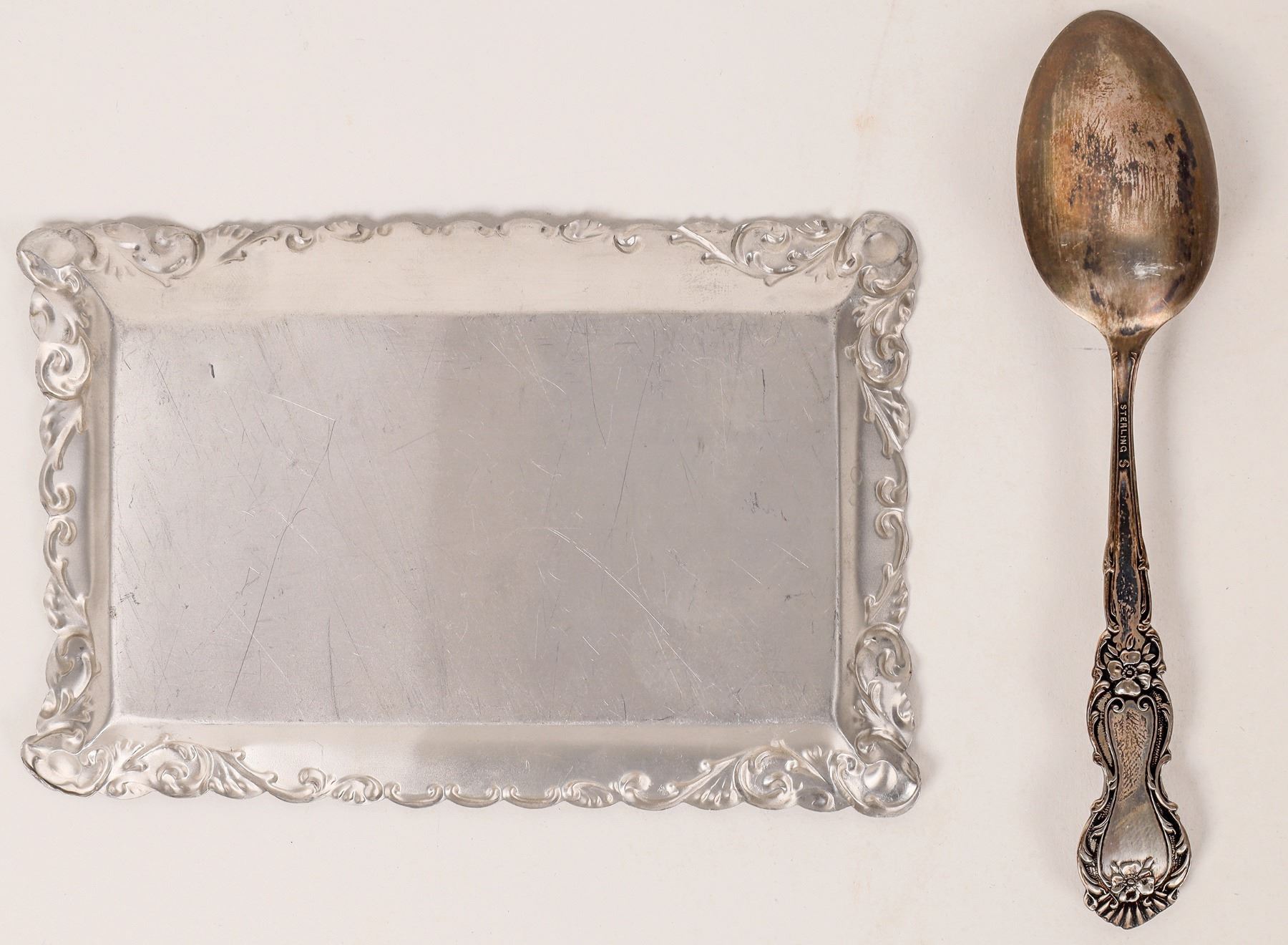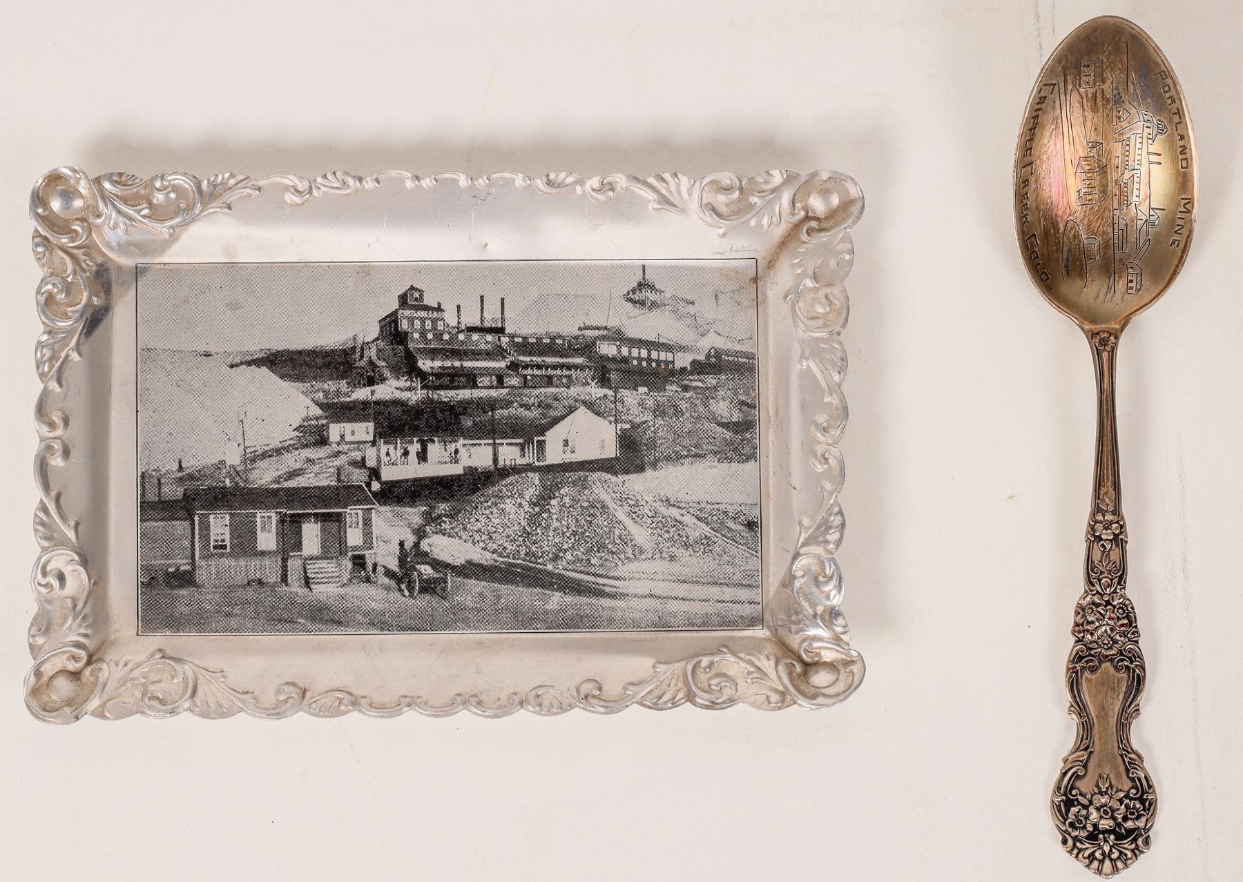 Portland Mine Sterling Silver spoon, 5". Aluminum tray with Portland Mine building photo, 3x4.75". Colorado Cripple Creek Gary Bracken Collection