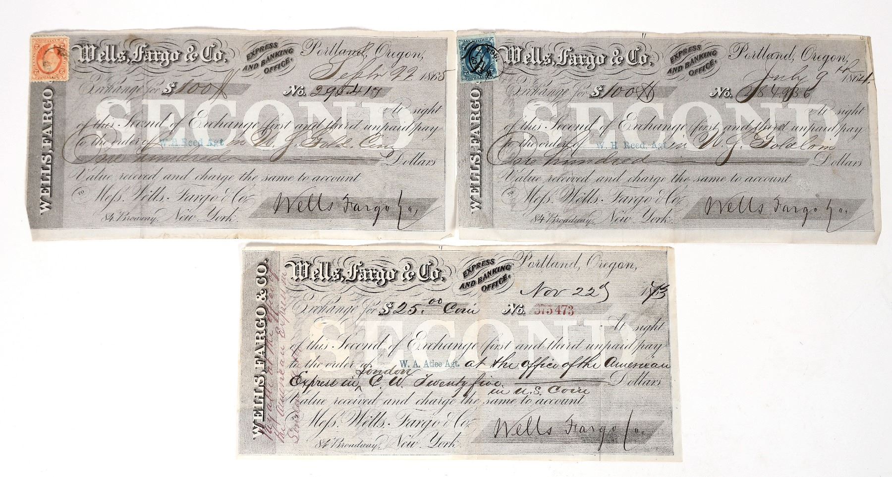 Three documents from the Portland Oregon Wells, Faro & Co. express and banking office. Dated 1864, 1865 & 1873. Two with adhesive revenue stamps. W. A. Atlee and W. H. Reed as Wells Fargo agents. Payable in U.S. gold coin. Each document 9 x 5 inches.