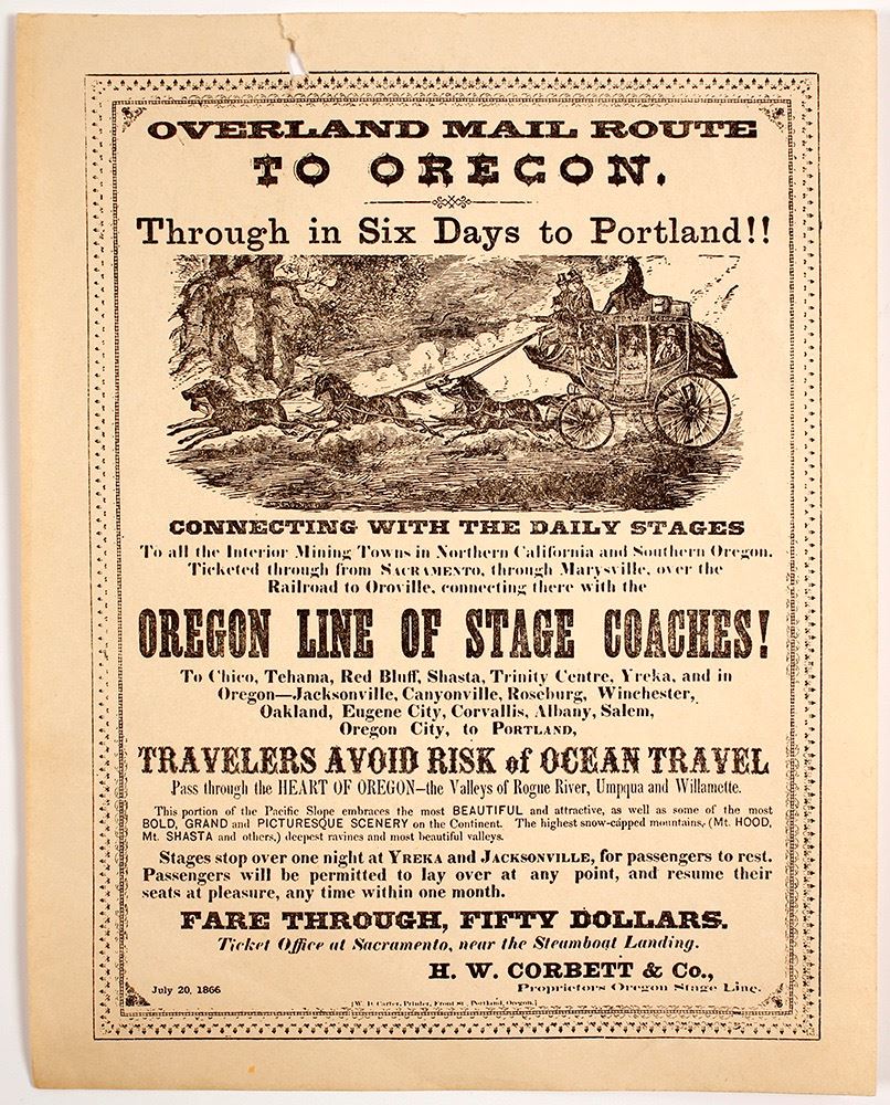 Appears to be a Portland Overland Mail Route Handbill Reprint done in the 19th Century. Nice coach and 6 horse woodcut.Dated July 20, 1866. Travelers avoid risk of ocean travel from Sacramento to Portland. Small hole on upper left, approx 8.75" x 7" HWAC# 61740 Date: Location: Portland, Oregon