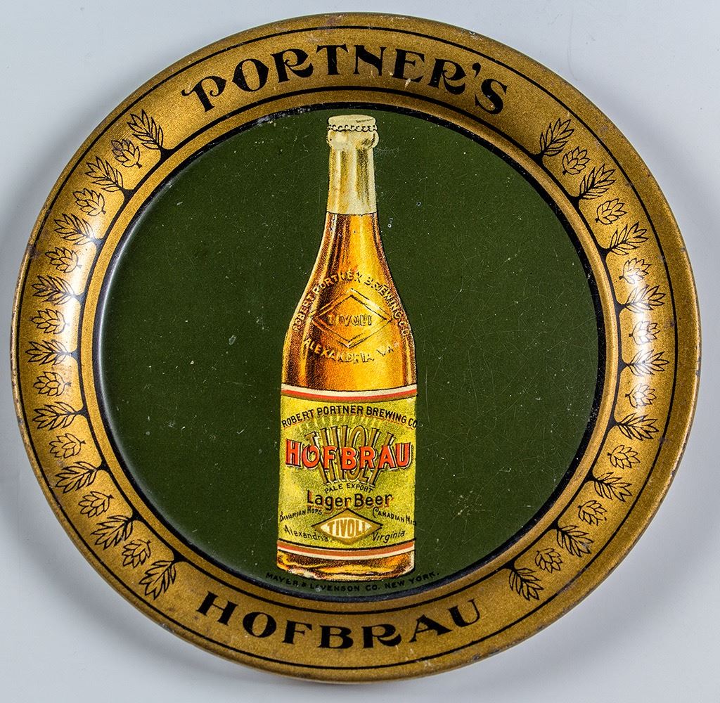 Portner's Hofbrau, Alexandria, Virginia Small beer tip tray. The tip tray has a picture of the embossed Hofbrau Lager Beer bottle with paper label. Generally very fine. City: Alexandria State: Virginia Inventory Number: 38974