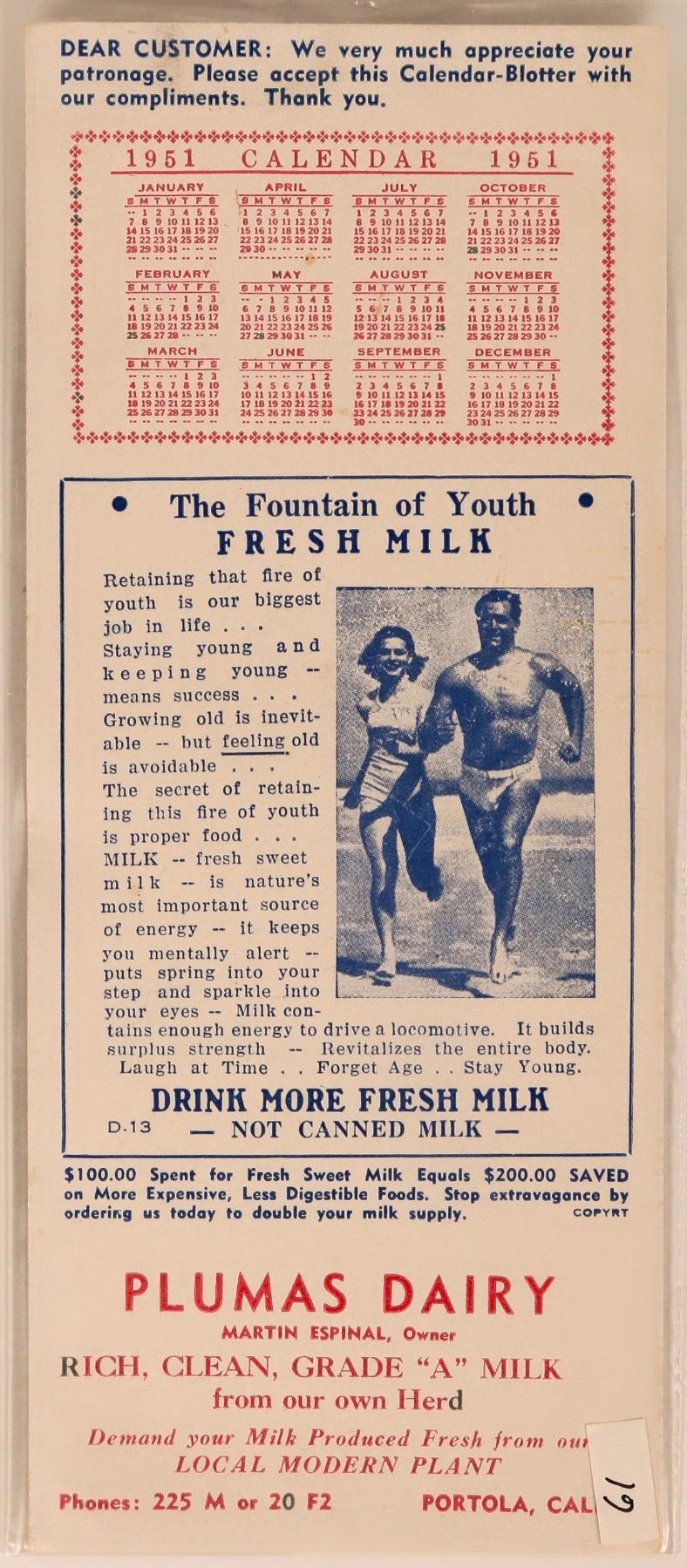 An advertising blotter for Plumas Dairy for "Rich, Clean, Grade 'A' Milk" from local modern plant in Portola, CA. This blotter includes a calendar for the year 1951. Milk is touted as "the Fountain of Youth!" A photograph of a fit couple running along the beach help convince the customer of the benefits of drinking fresh milk.