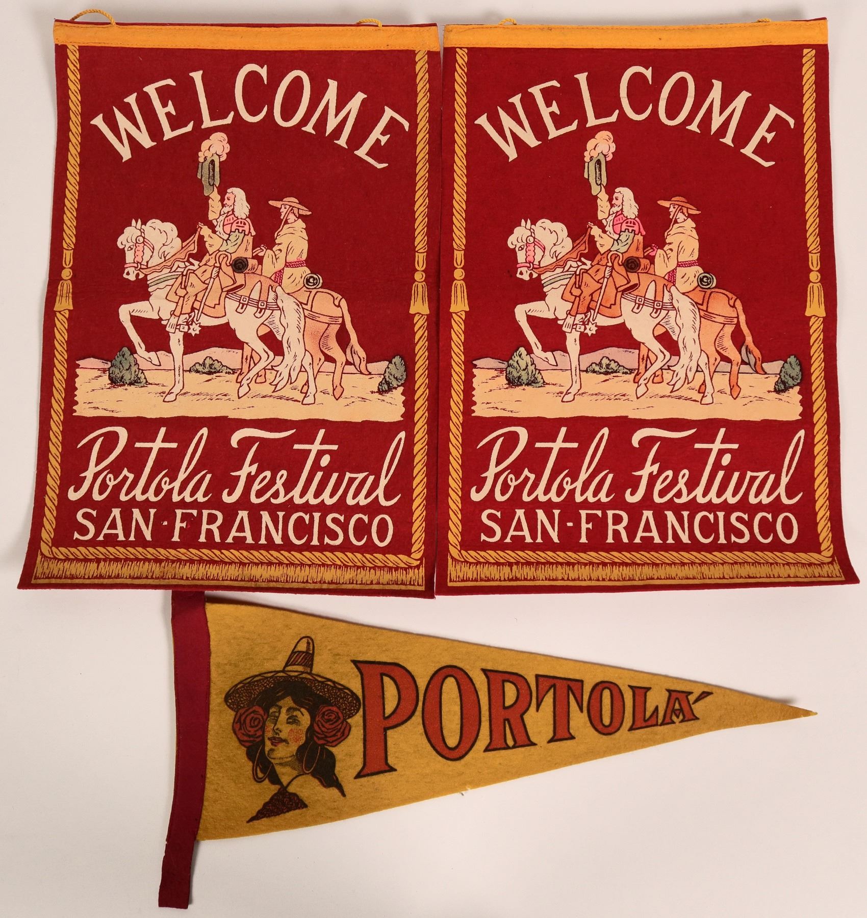 The San Francisco Portola Festival was held October 19 - 23, 1909. It honored Don Gaspar de Portola, the discoverer of San Francisco Bay. It was also a celebration of a city which, just three years earlier, lay in ruins. The festival ran each subsequent year until 1913. These two identical banners measure 18"x 12" and are in near new condition. Also in near new condition is an 18"x 12" 1950's era poster from the famous Calaveras Jumping Frog contest.