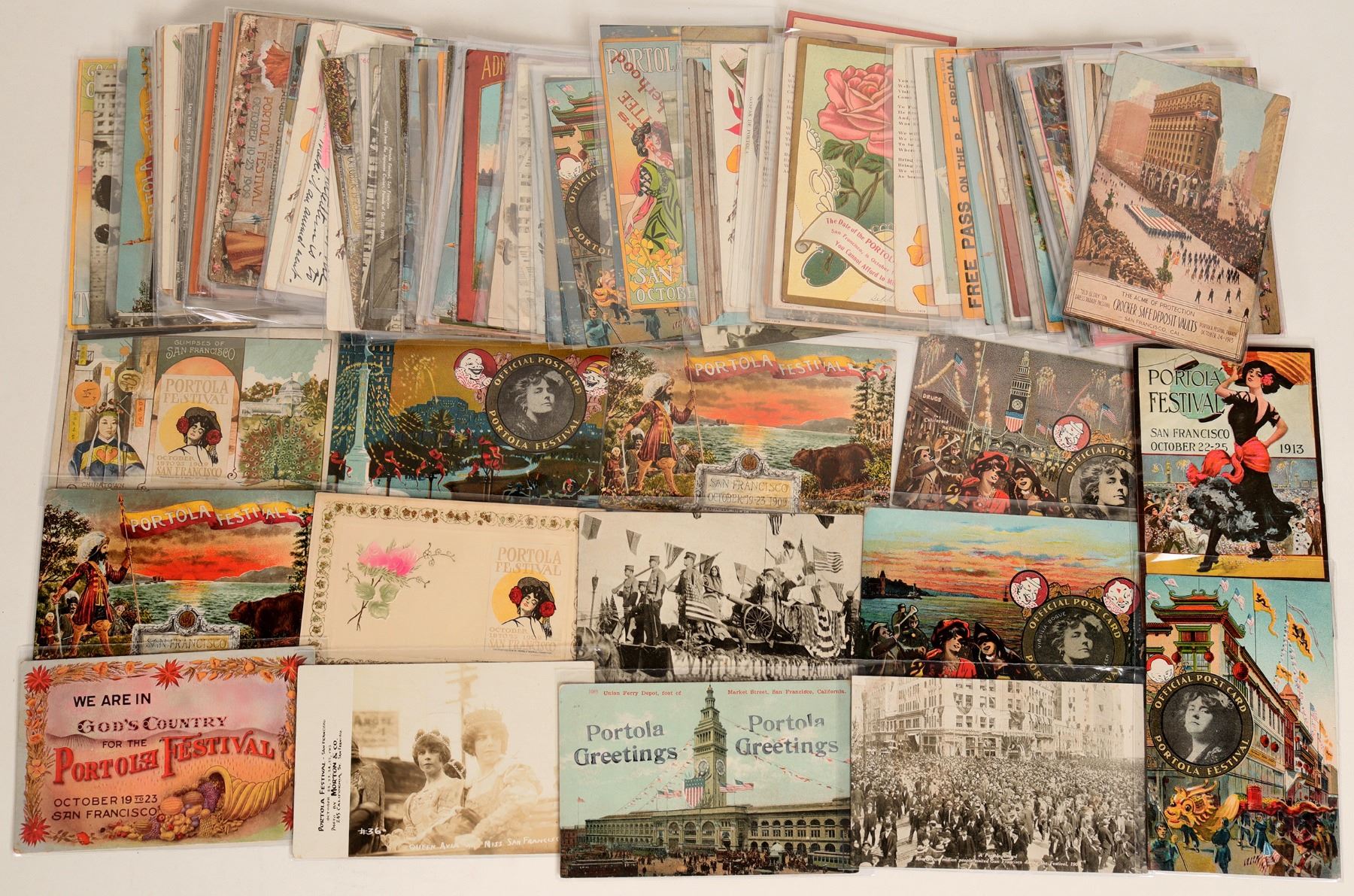 Approx 120 very colorful postcards from the Ken Prag Collection featuring the Portola Festival, which began in October of 1909 as a way to promote the rebirth of the city three years after the devastating earthquake. The festival honors Don Gaspar de Portola, the first European to discover San Francisco Bay. These are some of the most colorful postcards ever to come out of California. All are in plastic sleeves. See photo for a representative sampling.