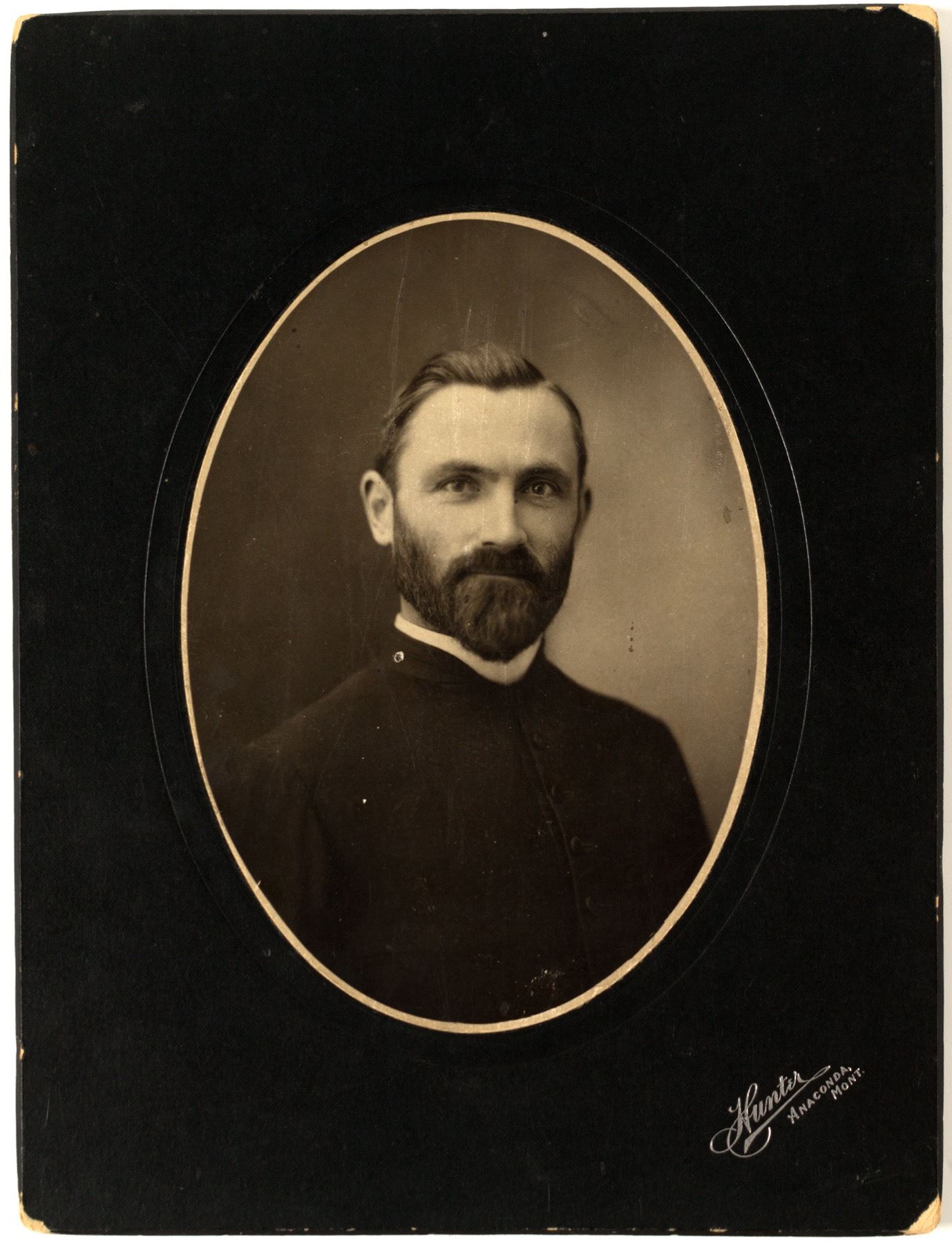 Photograph portrait of Reverend A.R. Coopman, who began his work in territorial Montana where churches were sparse and struggling. He spent his first year (1888) in Helena reaching out to surrounding areas and towns. He founded the First Catholic Church at Great Falls in 1889 before being transferred to Bozeman. He constructed 2 more churches before taking charge of St. Peter's church in Anaconda, paying off its $4000 debt, and completing it along with a parochial school over 13 years in Anaconda. State: Montana City: Anaconda HWAC#: 40860 Date: