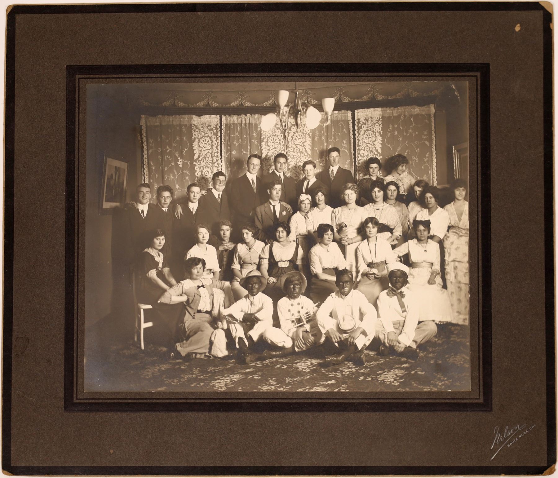 Nelson photography of Santa Rosa took this portrait of a large group of young people, with the four seated in front in blackface. Photo is 10 x 8 inches mounted on a 13 x 12 inch board. Names of the students written in pencil on the back.