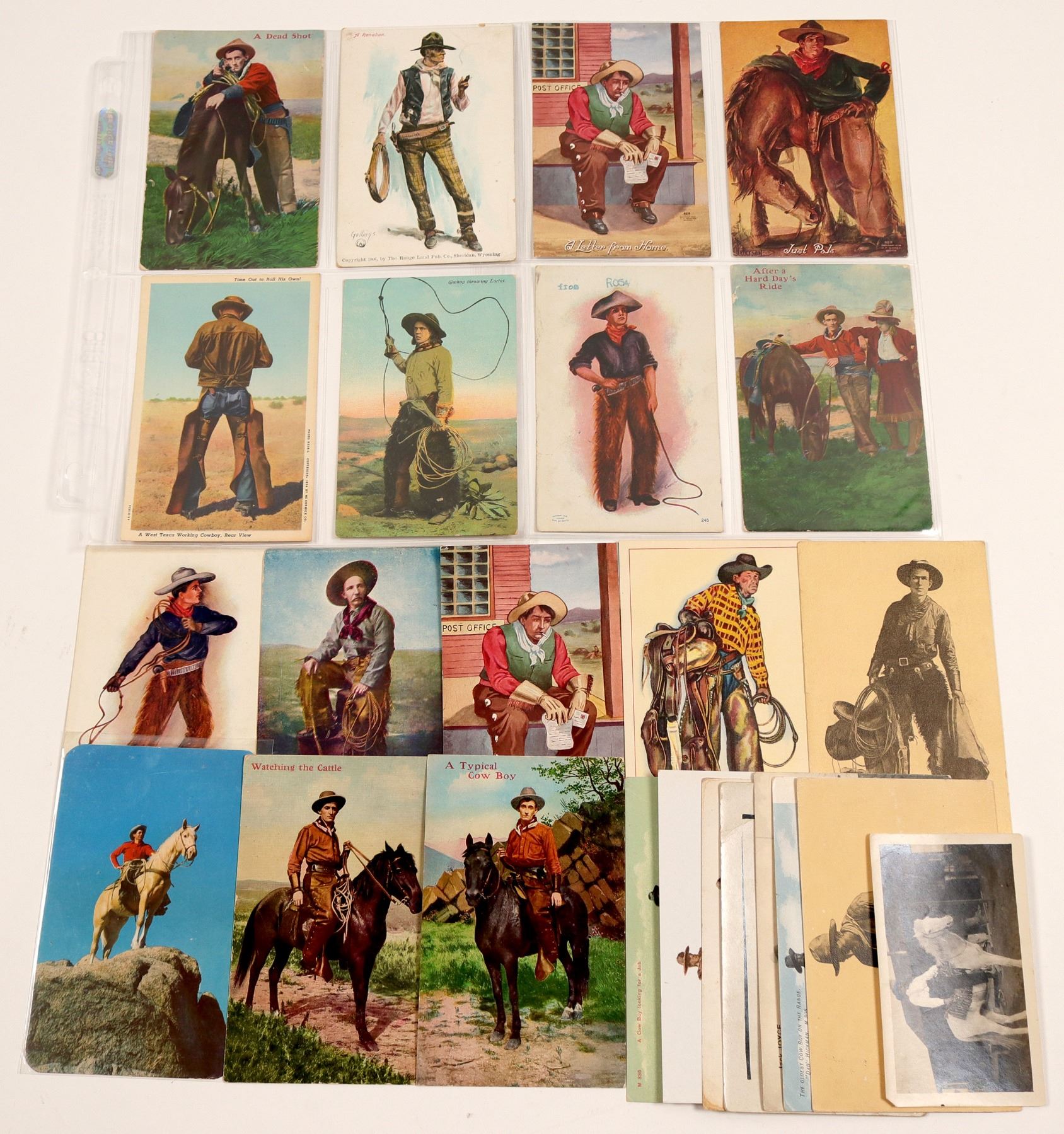 24 posed cowboy pictures. One by artist Megaree of a cowboy carrying his saddle called "Chuckwagon Pete." Two pictures in black and white by J. Richard Parry Jr - "Holding My Own with cowboy holding his saddle (1907) and another "Leisure Moments"(1908) with cowboy writing. 21 possed postcards of cowboys including 1 duplicate. 13 with cowboy posed on horse, 5 with lasso, 1 reading a letter, one rolling a cigarette