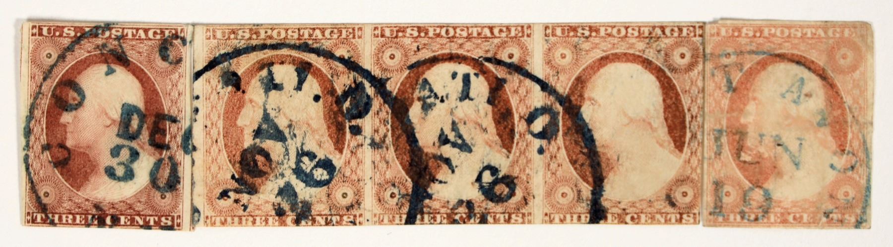 Possible Scott #10, type 1. Difficult to determine. Inner frame line weak, blue cancelation mark. 3 attached stamps, with design cut into on the bottom. Dark dull red stamp with tight trim, cut into left margin line. Light dull red with a chipped upper left corner. See photo.