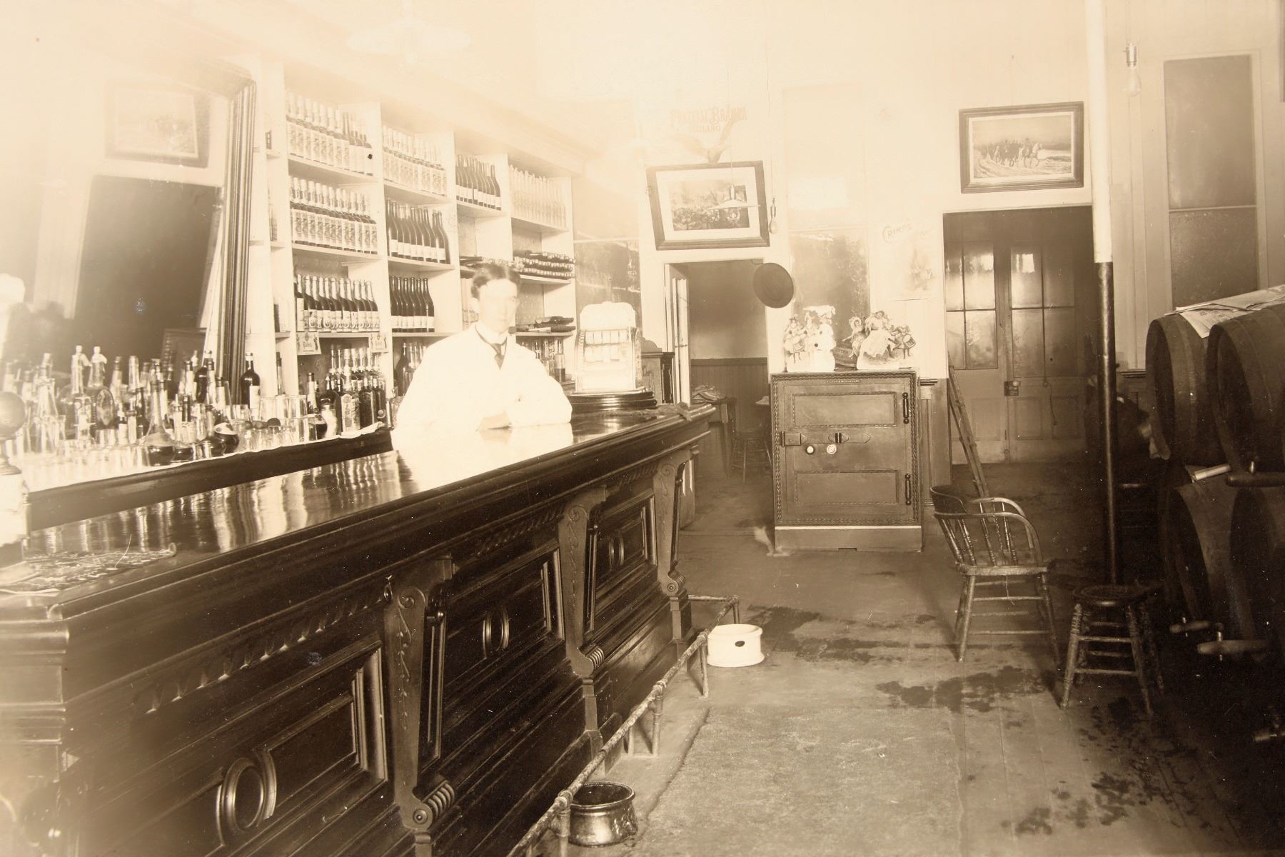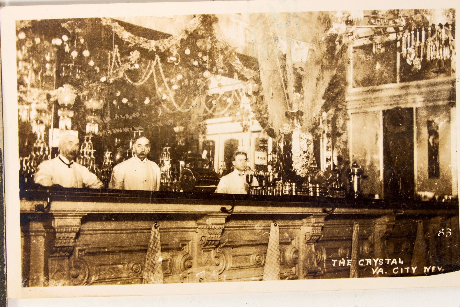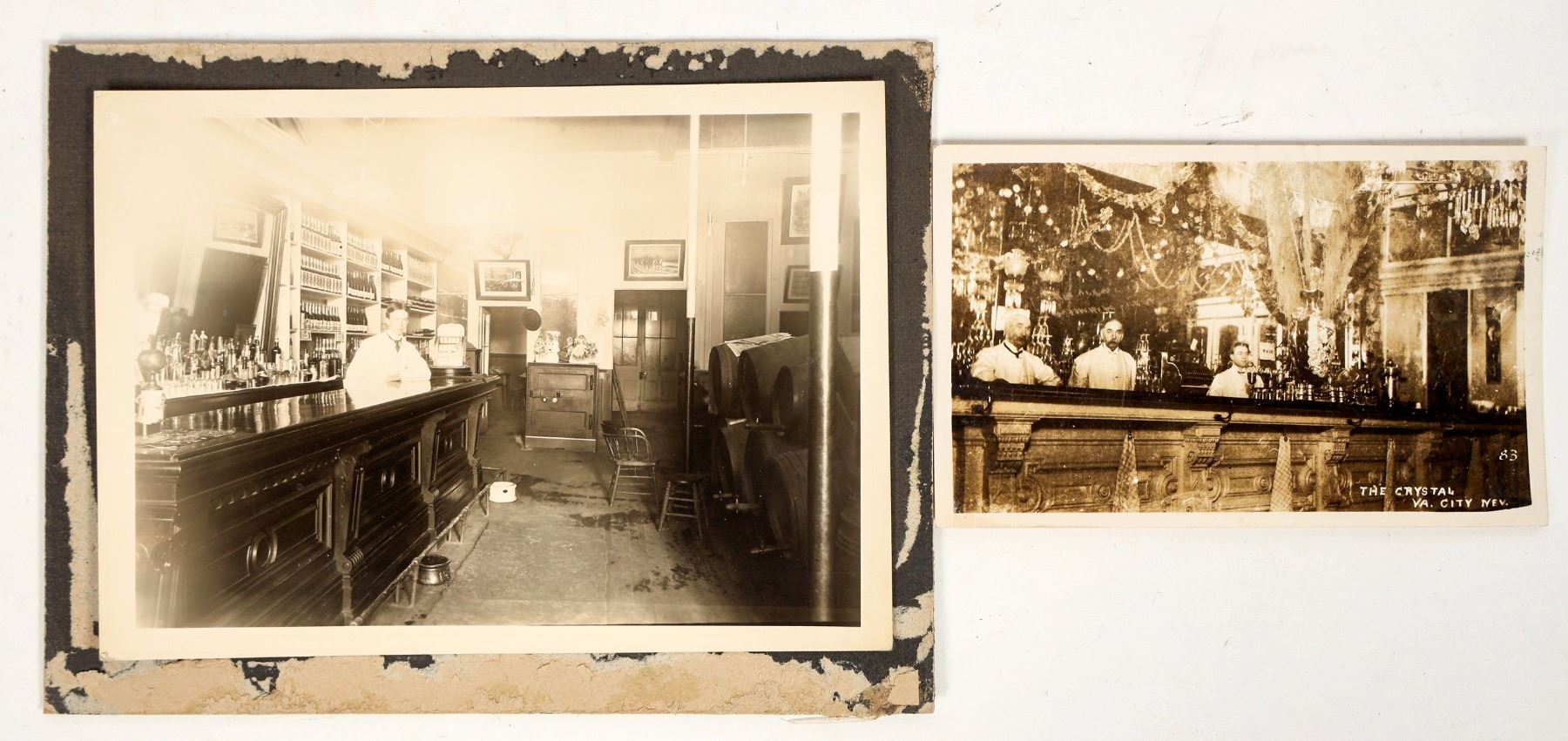 Lot of 2. 1) Photo of the interior of a brewery saloon: notice the beer barrels/kegs on the right side of the photo and the rows of beer bottles on the left behind the bartender. All the beer on the wall was for retail sale. You can also see a trade stimulator on the counter. The back of the photo has the identification of "Virginia City Nev 1898 Willie Marks." William H. Marks worked for Con Ahern at the Crystal Bar and eventually took over ownership in 1913 when Ahern died (see Fred Holabird's Coins of the Comstock). The young man in the photo does bear a resemblance to Marks when compared to other known photos, but it is not perfect. Virginia City did have the Nevada Brewery and Virginia Brewery, as well as numerous others later on. It is unclear if Marks ever worked at one of these breweries before bartending at the Crystal. Photo is 4.75 x 7", detached from old matte. More research is needed to confirm or deny the identification on the back. 2) Rare RPPC c.1905 view of the Crystal Bar in Virginia City with Con Ahern and William Marks behind the bar (on the right). Not mailed.