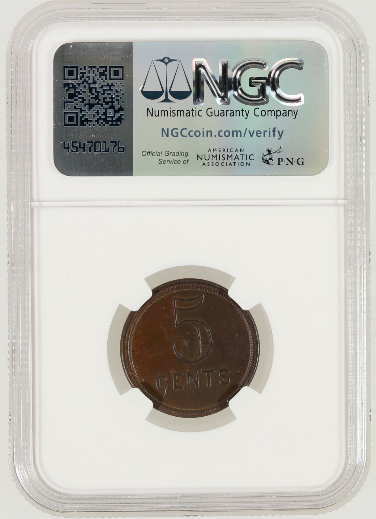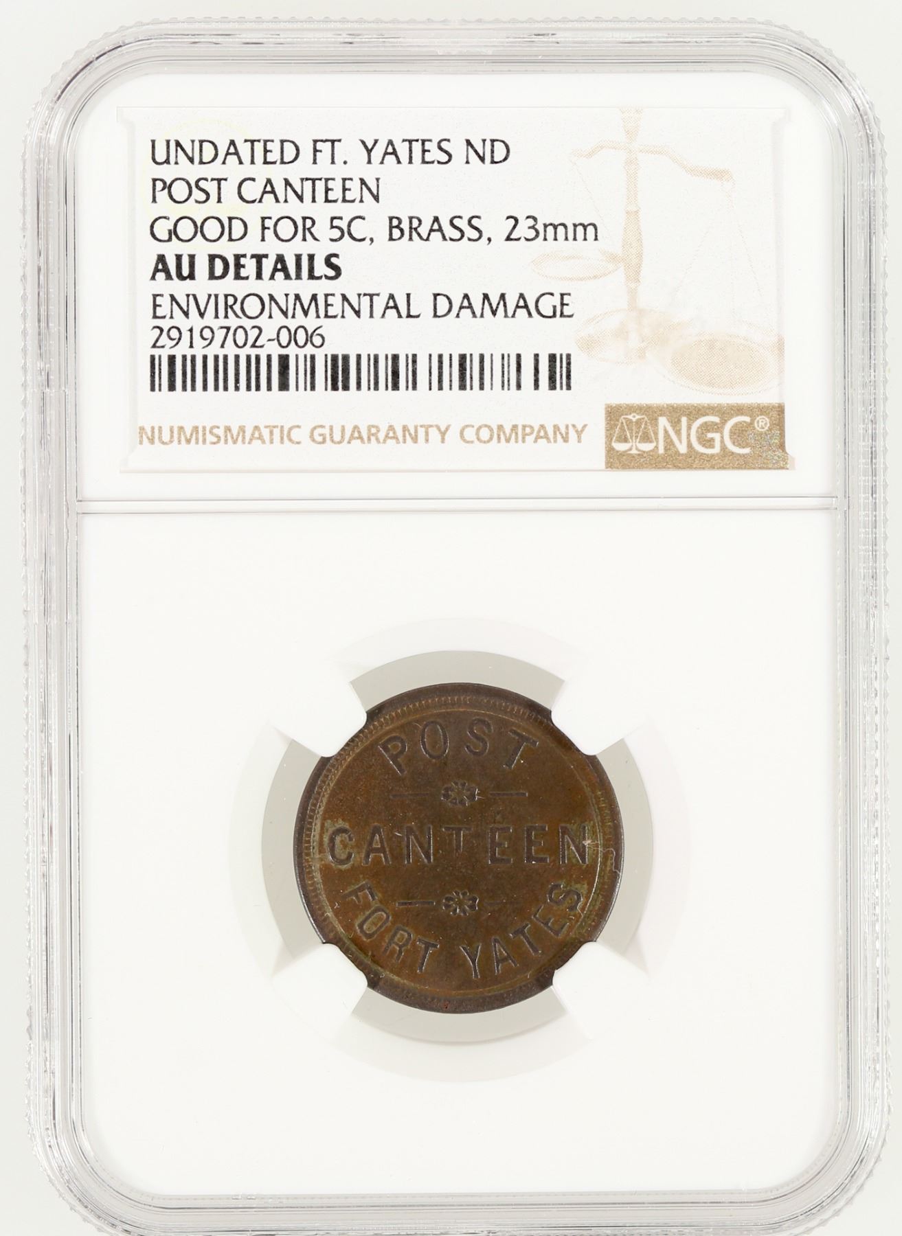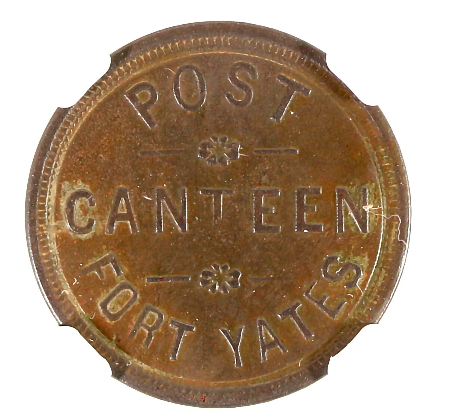 NGC certified AU Details: environmental damage. POST / CANTEEN /FORT YATES // 5 / CENTS; Br., rd., 23 mm. Fort Yates named after Captain George Yates, killed with Custer at the Battle of the Little Big Horn.