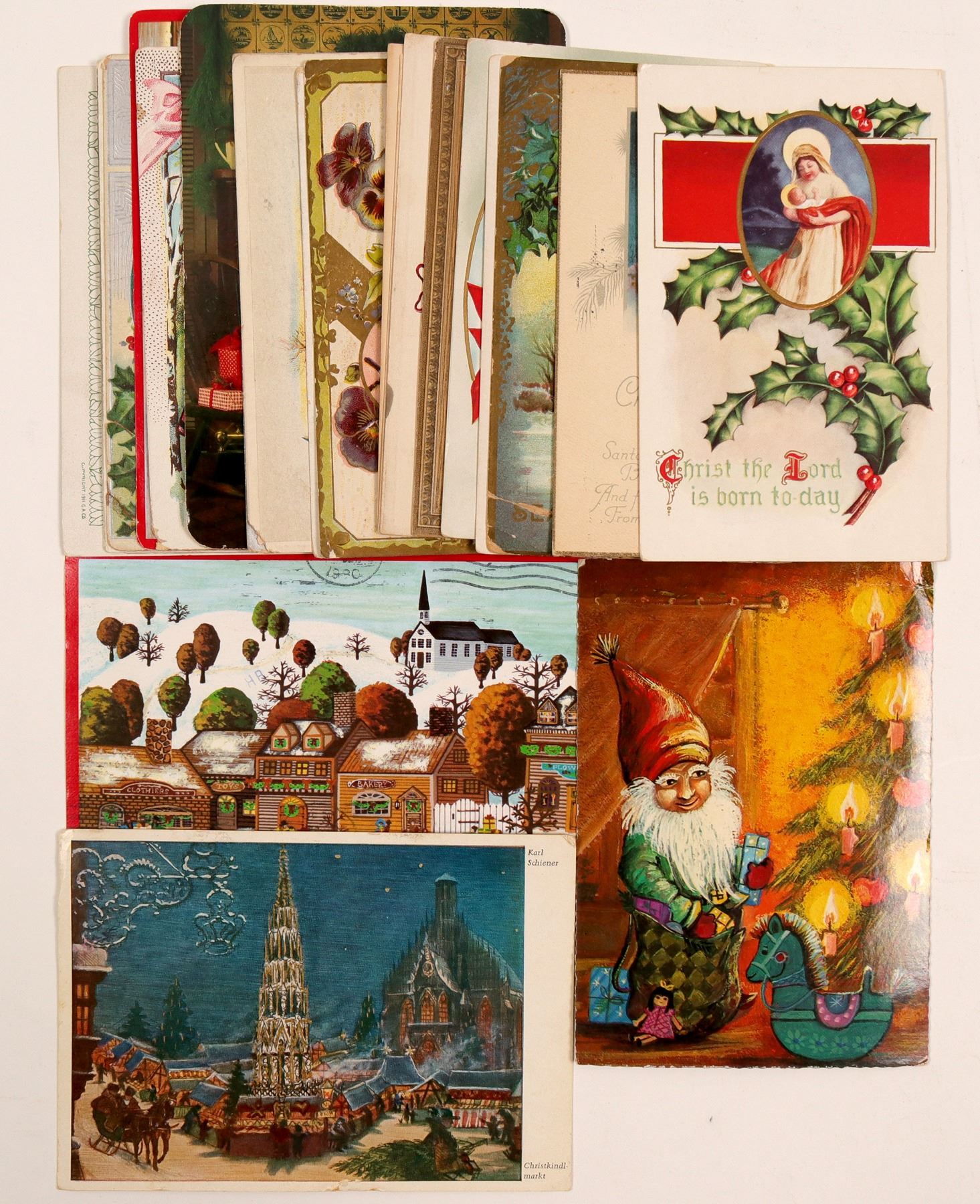 Here is a nice small grouping of holiday cards. Items #1- # 18 of #24: Various Christmas cards with winter scenes, Santa , angles, etc. Items # 19-#24 of #24 : New Years Cards & Easter cards : Auld Lang Syne, Flowers, kids and bunnies. All most all in nice condition. Great pictures. ( RH).Houghton Estate Collection
