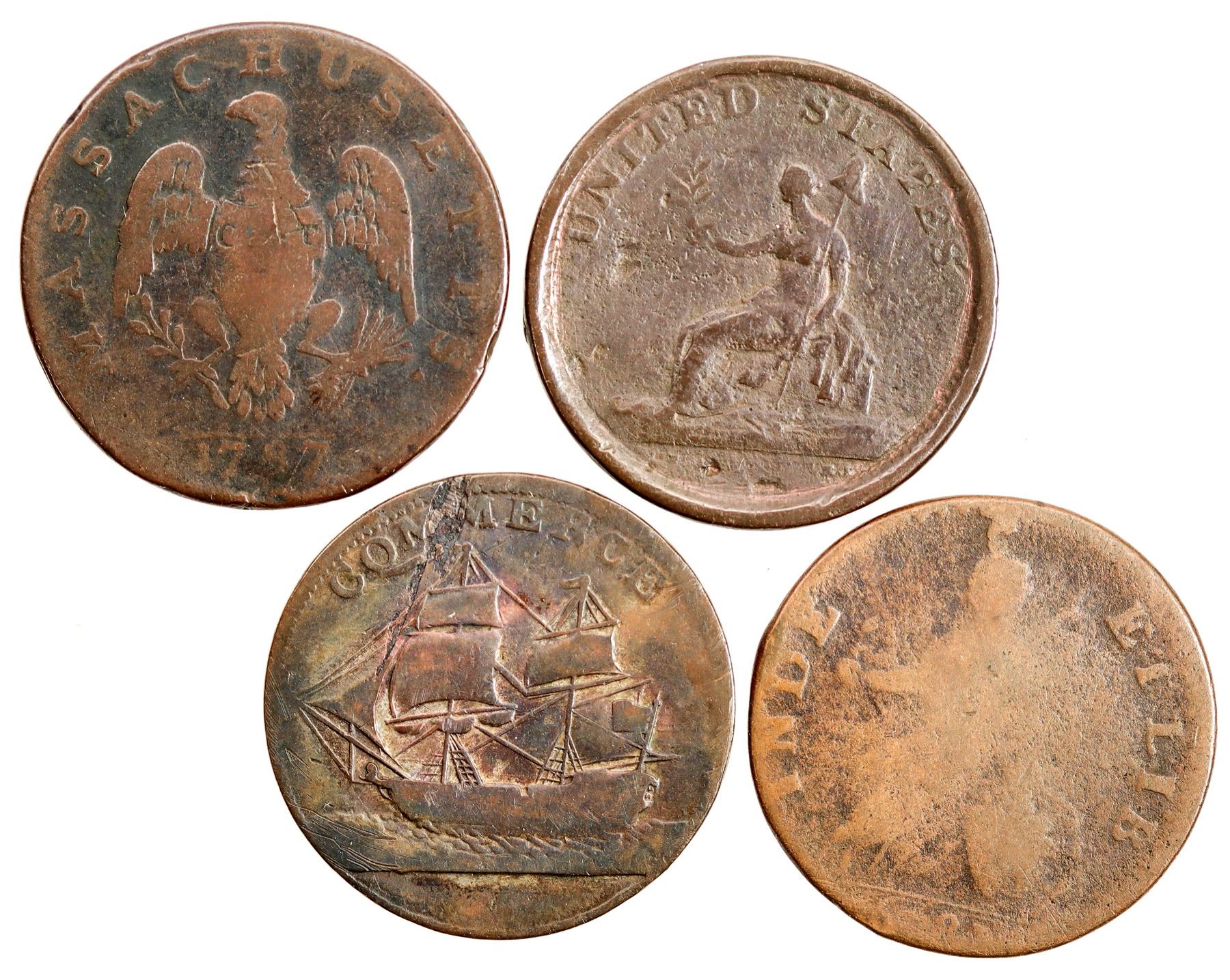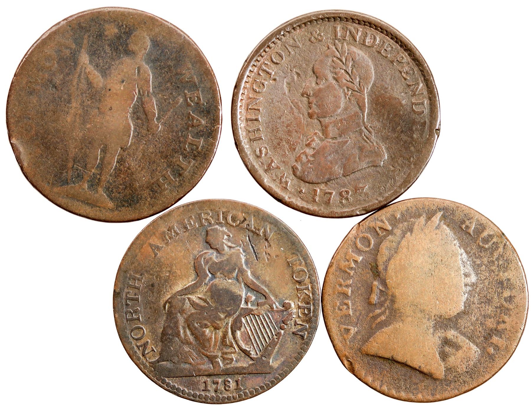 Lot of four post-colonial coppers: 1) 1787 Massachusetts Cent, arrows in left talon, AG; 2) 1787 Vermont Bust Right, P-AG; 3) 1783 Washington Portrait Piece, large military bust, AG-G; 4) 1781 North American Token, G-VG.