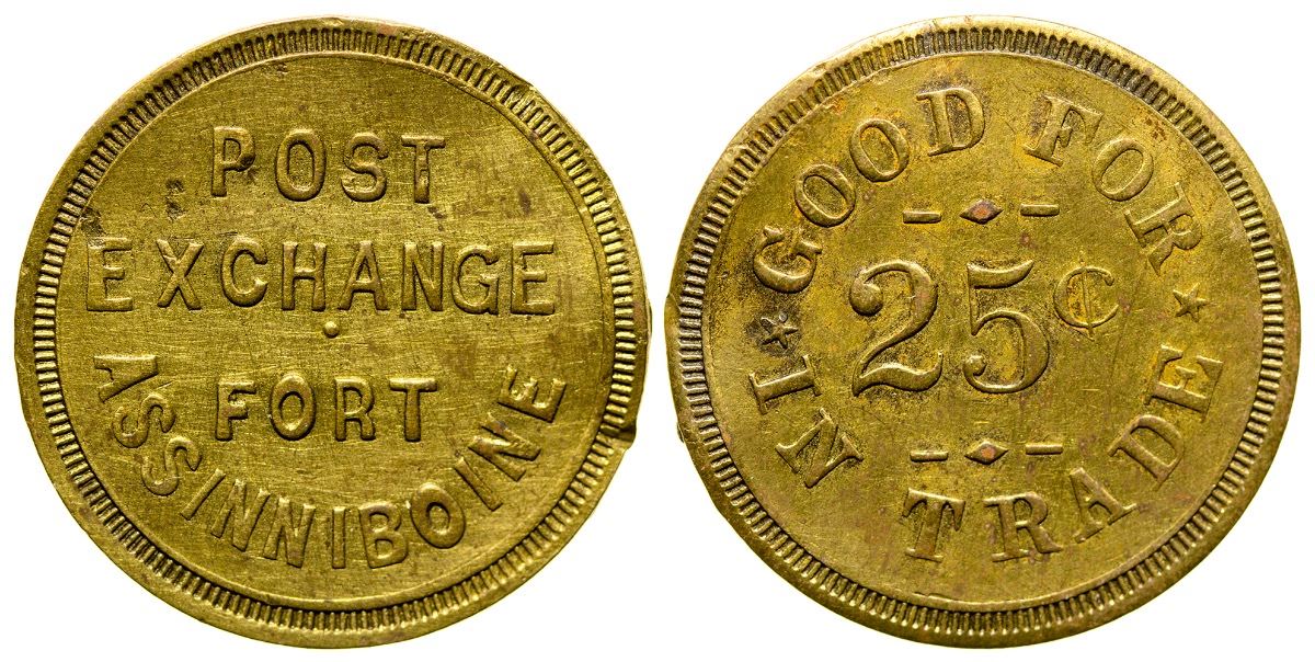 R-11. Post / Exchange / Fort / Assinniboine // GF / 25c / IT. Brass, 26mm. Fort Assinniboine, was a United States Army fort located in present day Montana (historically within the military Department of Dakota), built in 1879 and in operation through 1911. (Svoboda Collection) City: Fort Assinniboine State: Montana Date: HWAC# 33862