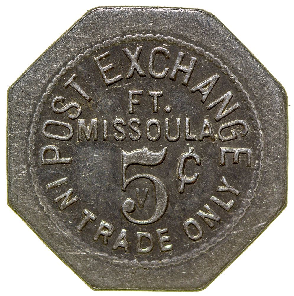 Obv.: Post Exchange / Ft. / Missoula / 5c / In Trade Only. Rev.: blank. Octogonal, Alum., R-9. City: Fort Missoula State: Montana Date: ID: 36847