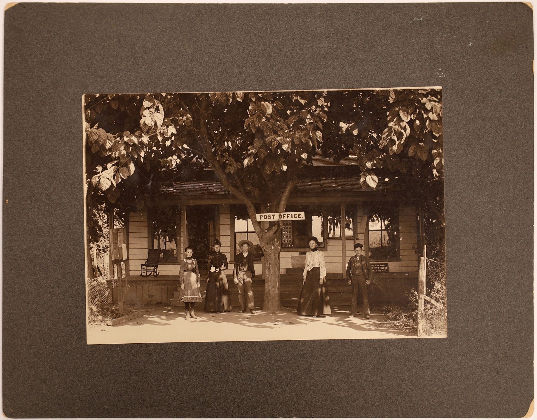 This unique photograph features a family of five standing in front of what is thought to be the Orosi, California post office. On the porch of the post office is a sign reading "Fresno morning Republican for Sale Here." This newspaper sold between the late 1800's to 1932. Taped to the back of the photograph is an original slip of paper reading "Orosi Post Ofc." and the family's names and positions in the photo. Photo measures 9-7/8 x 7-15/16 inches.