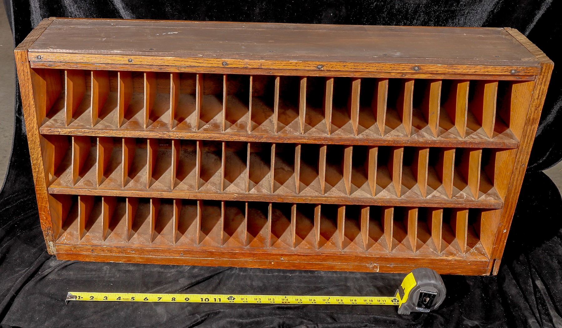 Tabletop letter-sorting box made of straight-grained white oak with dovetailed joints on the base. It has three rows of 18 compartments, each with dividers. This unit would have been placed on a waist-high tabletop. The top panel has been replaced. 36 x 17.5 x 8 inches. Chipped piece at lower left. c1880s-1900. LOCAL PICK-UP ONLY.