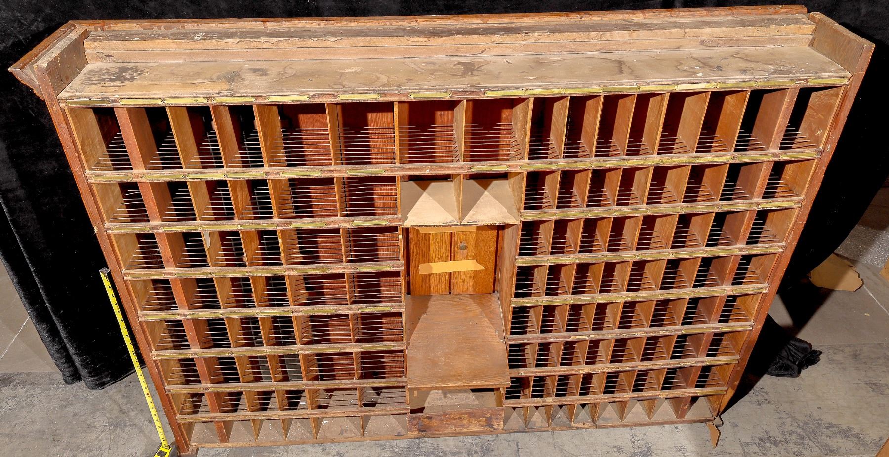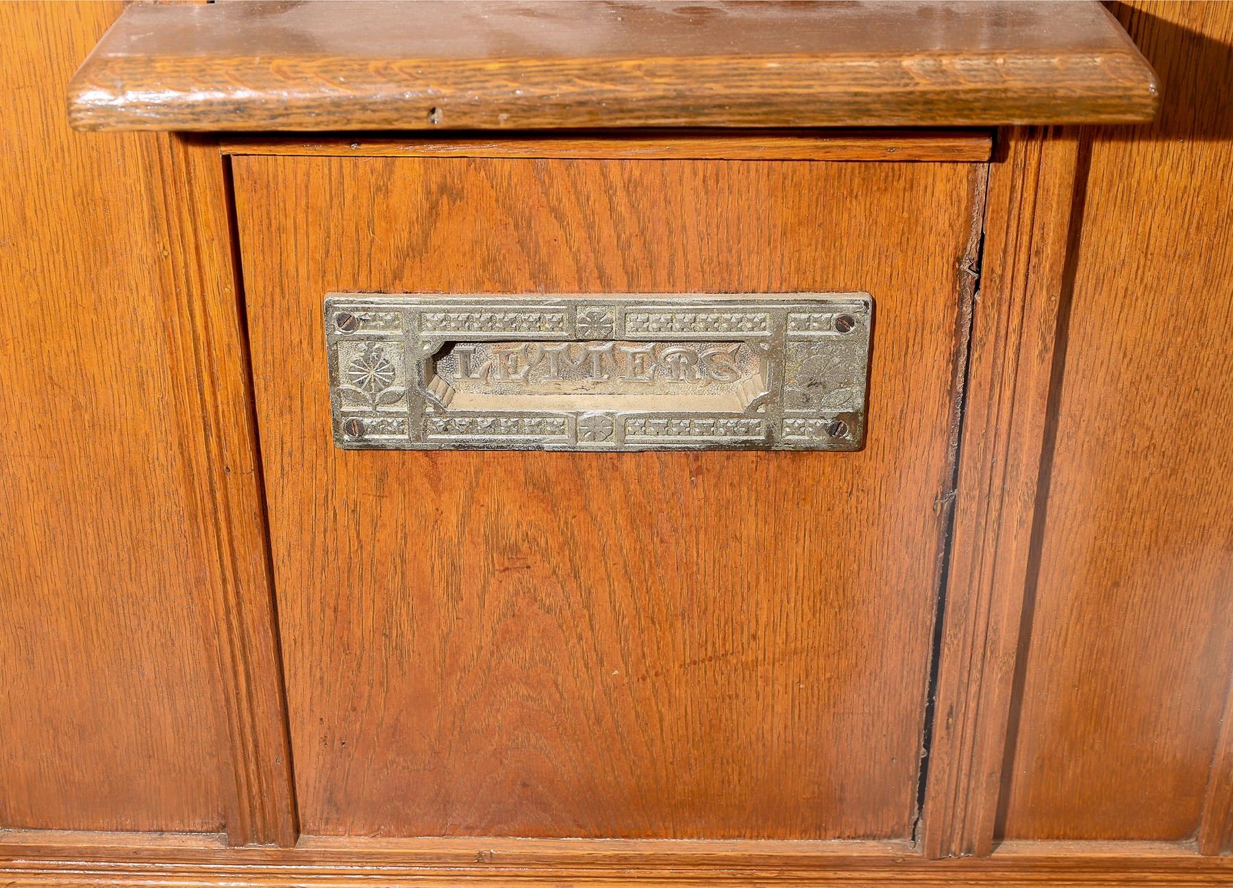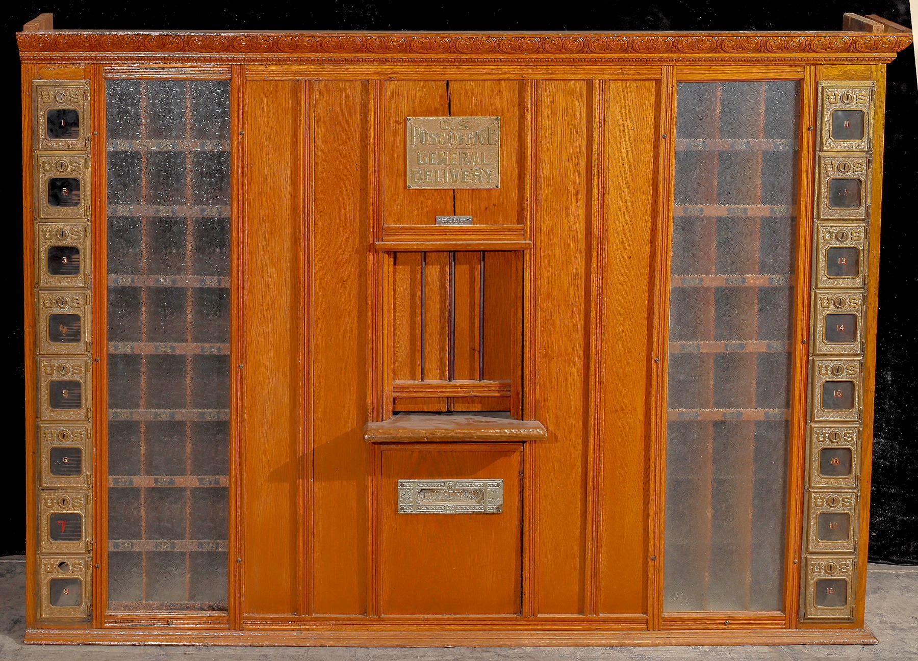 Original, small Post Office frontispiece from the Postmaster Supply Co of Baltimore, Maryland, and Kansas City, Missouri. It has a small, 8.5 x 12.5-inch window at front-center with barred door closure where the clerk would serve customers. Large brass plaque reads // General US Post Office Delivery //. There are eight, keyed post boxes at the left and right sides of the window. It has many slots in the back for letter sorting. Oak construction. It is 18 x 63 x 45 inches, c1900s-20s. See photo for details. LOCAL PICK-UP ONLY. Gary Bracken Collection
