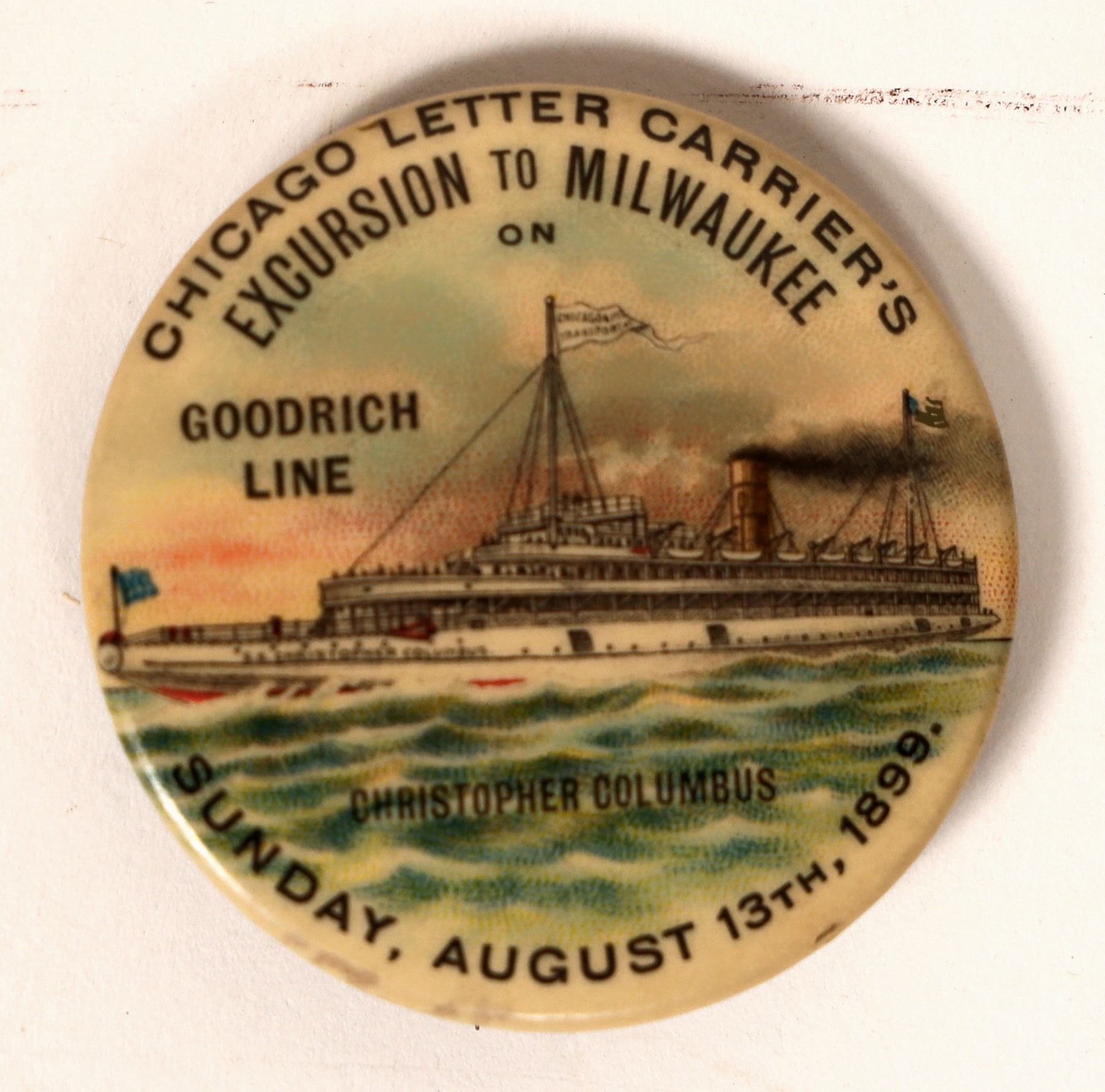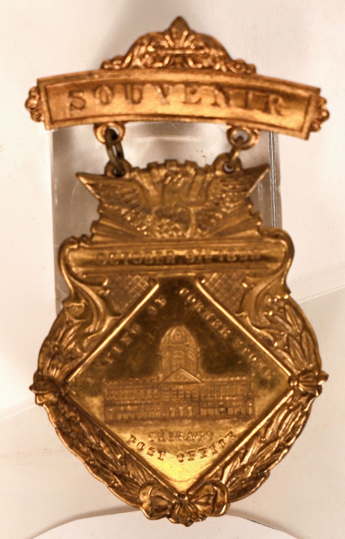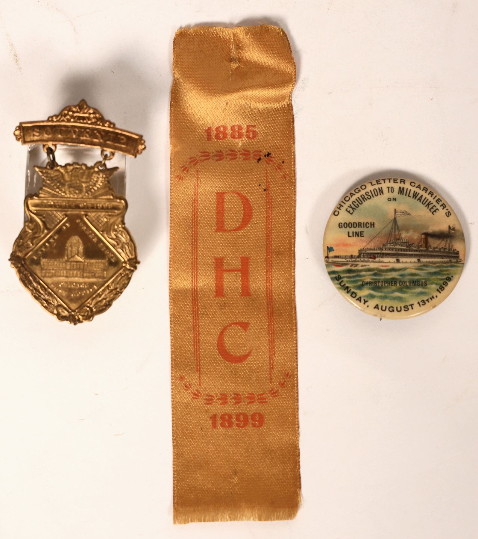 1899 Chicago Letter Carriers cloth and pin, and Chicago Post Office laying of cornerstone brass medal.