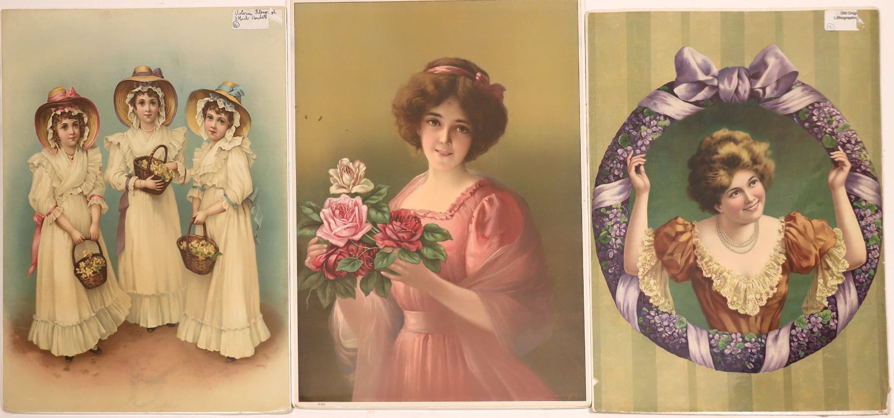 This group of three prints are post-war Victorian era prints. The first is a young lady holding a wreath of lavender colored flowers. The paper has a fabric texture. A woman with a red dress and roses printed in Germany. The last print is of three Victorian girls with flower baskets.
