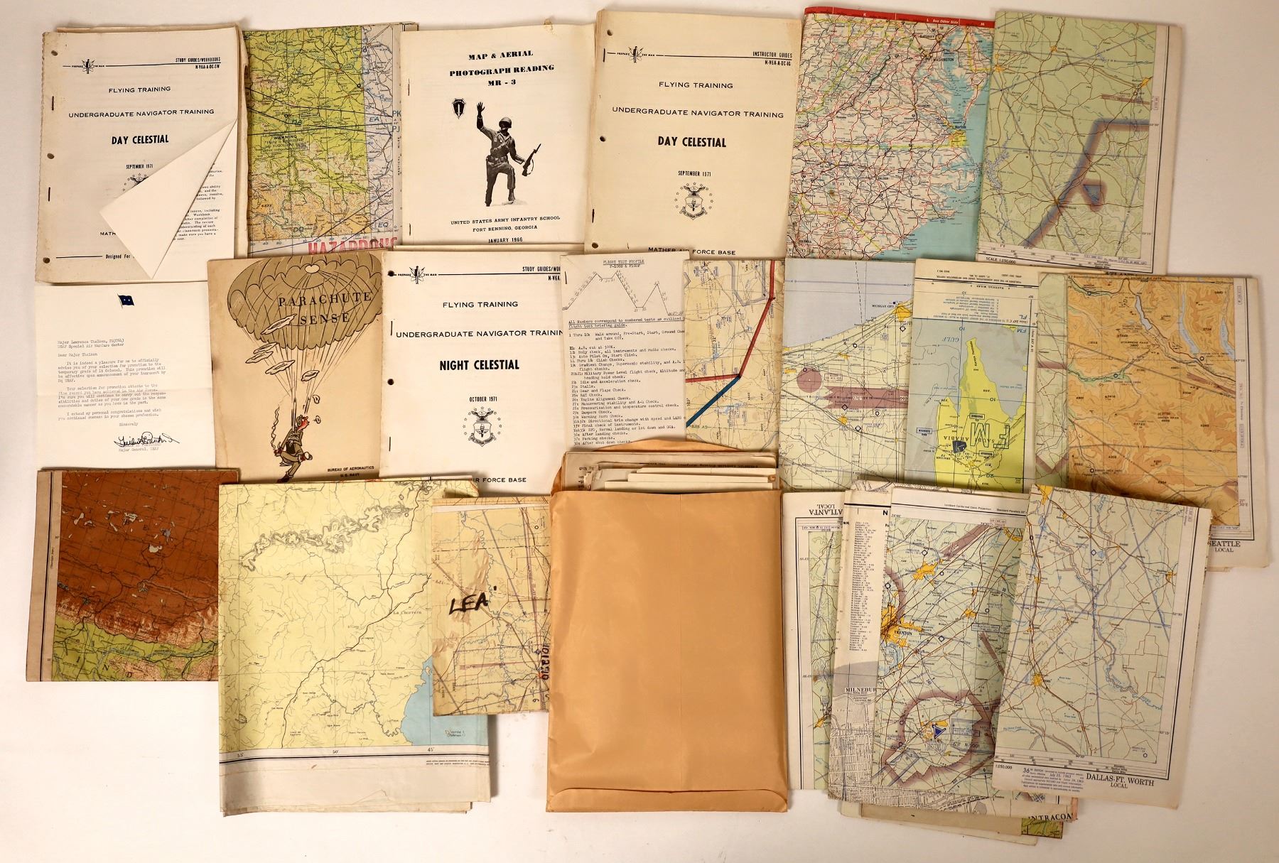 A nice collection of papers, maps, booklets and other ephemera of a military nature. Included are navigator star chart booklets issued by Mather AFB in California, Map & Aerial Photograph Reading, Parachute Sense and other pieces of military literature. Please see photos for more detail and condition.