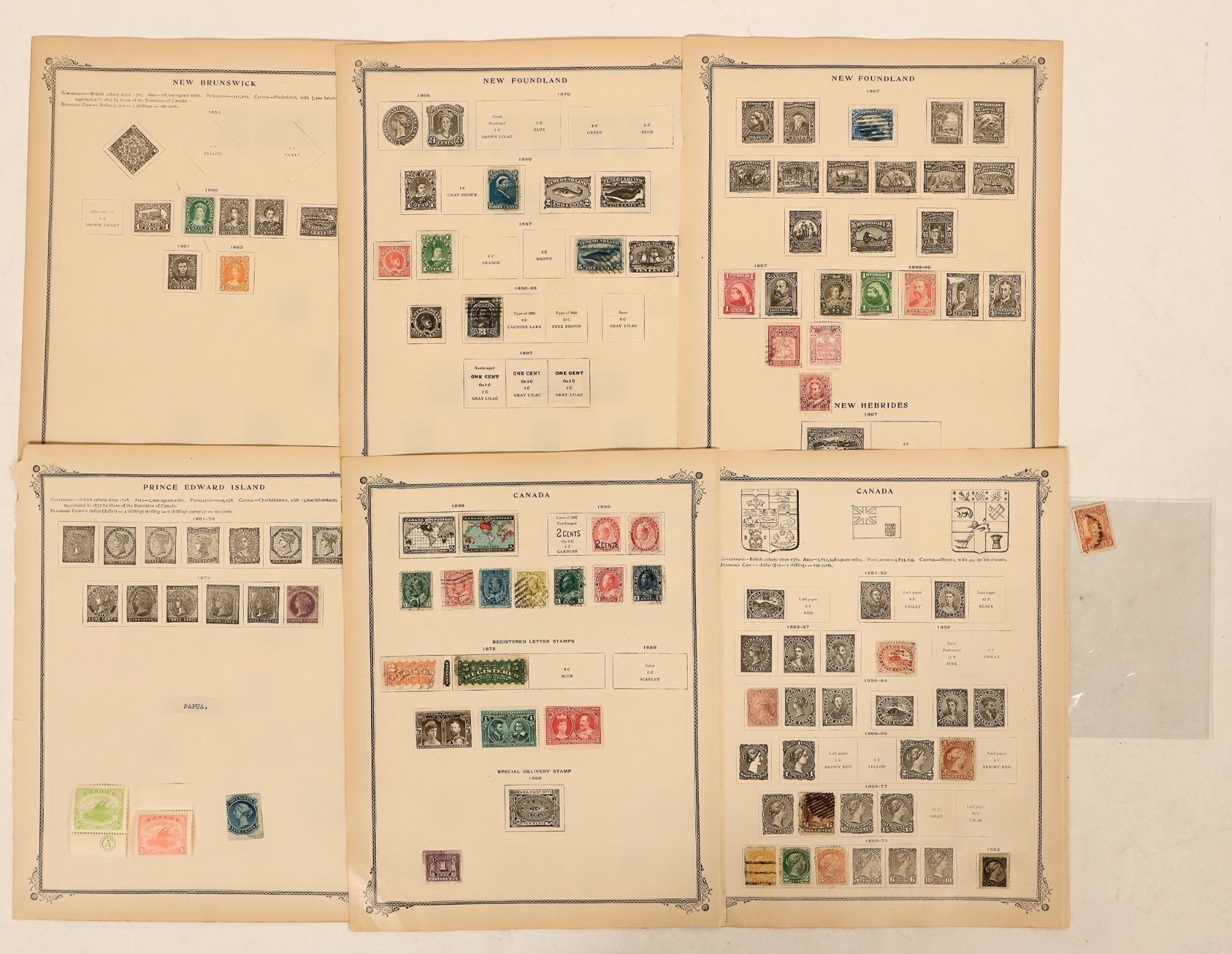 Collection of early postage stamps from Canada, c1850s-99. Includes: New Brunswick (2); Prince Edward Island (1); New Foundland (14); Nova Scotia (1). Canadian stamps include: 1875 registered letter stamps (2); 1897 Jubilee Issue (3); etc. Other countries include: Papua (2); Prussia (1). Denominations- 1/2-10. Mix of used and mint.