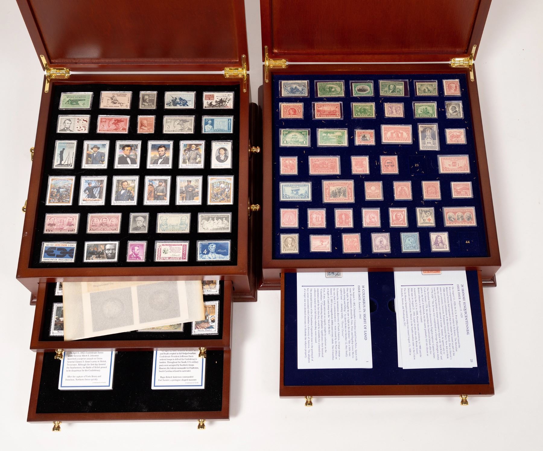 2 cherry wood finished boxes for displaying stamps and post cards. Includes mostly mint US stamps c. 1892-1990's.Cases about 4x11x12".