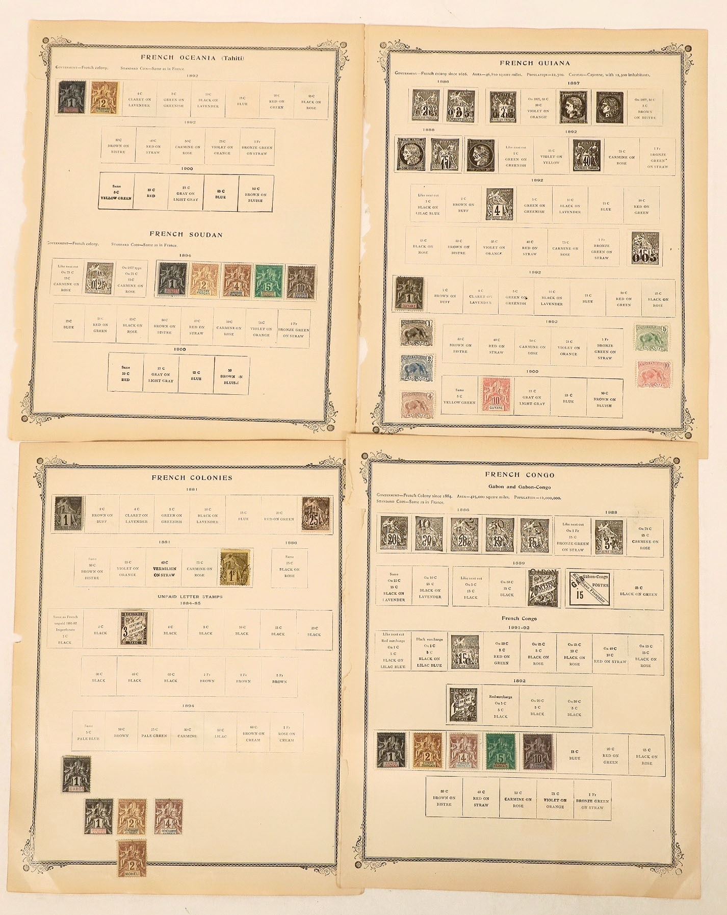 Early postage stamps from French colonies (36), c1876-1900. Colonies include: French Congo (7); French Guiana (7); French Guinea (3); French Oceania (Tahiti) (2); French Soudan (5). 1-10 denominations. Mostly mint, 2 canceled.