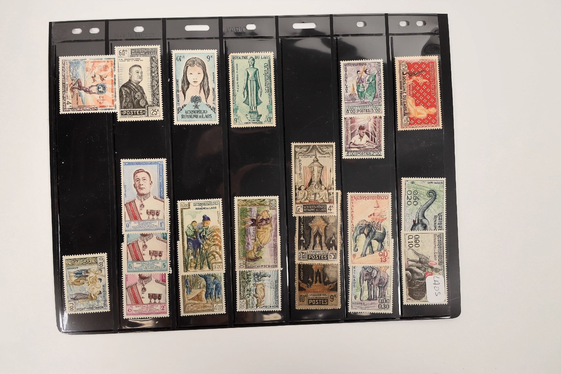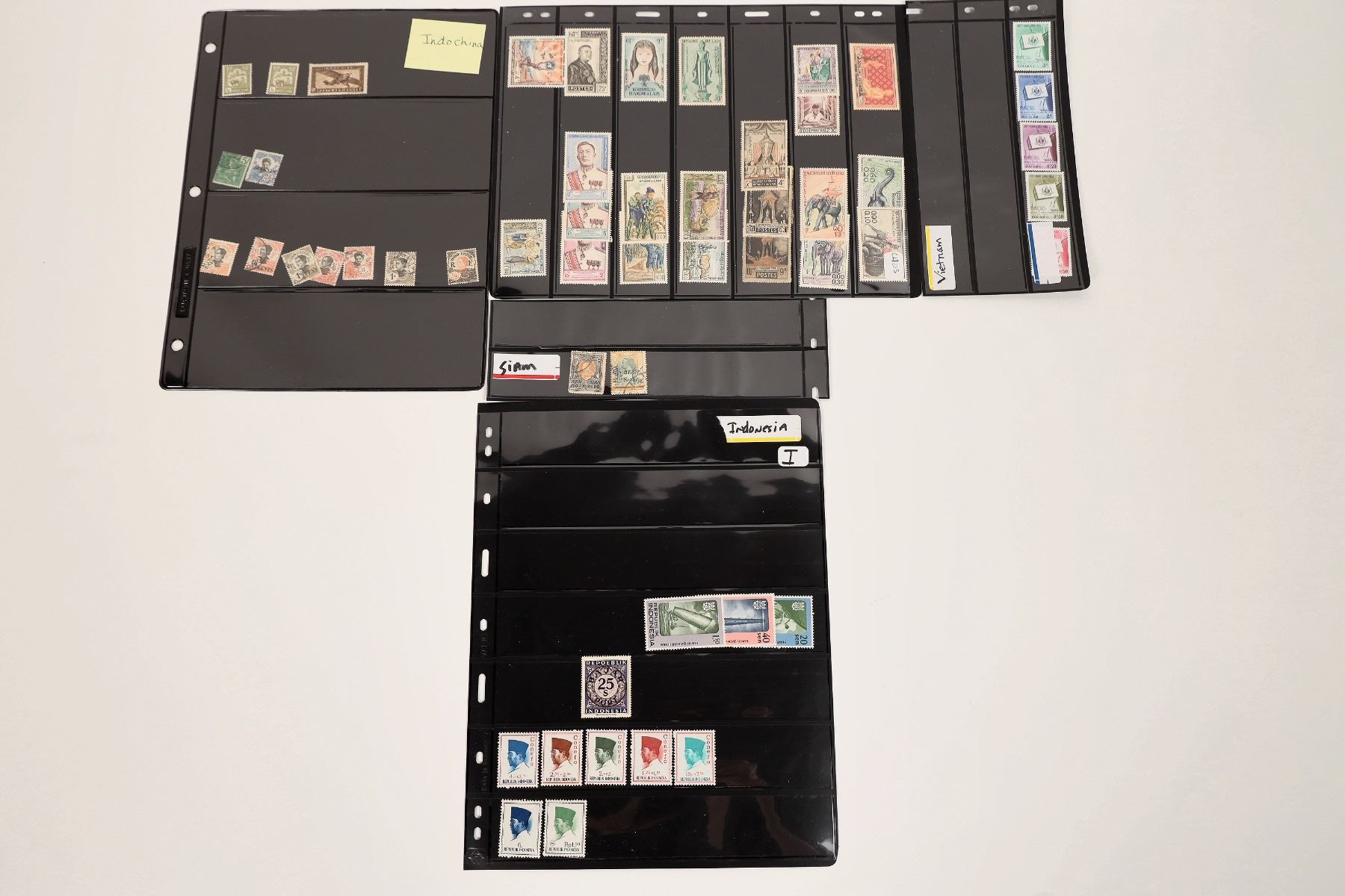Early postage stamps from Indochina, Indonesia, Laos, Vietnam and Siam (111), 1906-66. Indochina, (29), 1/10-25, c1906-38, 12 canceled. Indonesia, (11), 1.50-40, c1966, mint. Laos, (38), .50-11, 1959-66, mint. Vietnam, (5), .20-3, c1957, mint. Siam, (28), 2-15, 1910-40, all canceled. Stamps are listed by countries or regions, (approximate count), denominations, approximate dates if available, number used and/or mint.