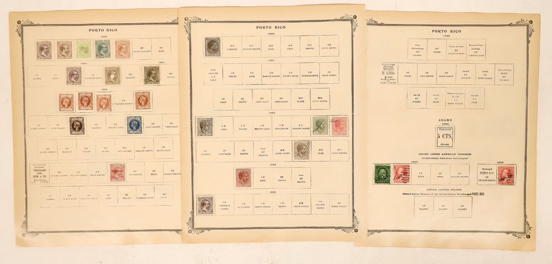 Early postage stamps from Puerto Rico (34), c1882-1900. 5 used, the rest mint. Denominations - 1/2-20. 3 issued under American dominion-U.S. Adhesives Surcharged, 1899-1900.
