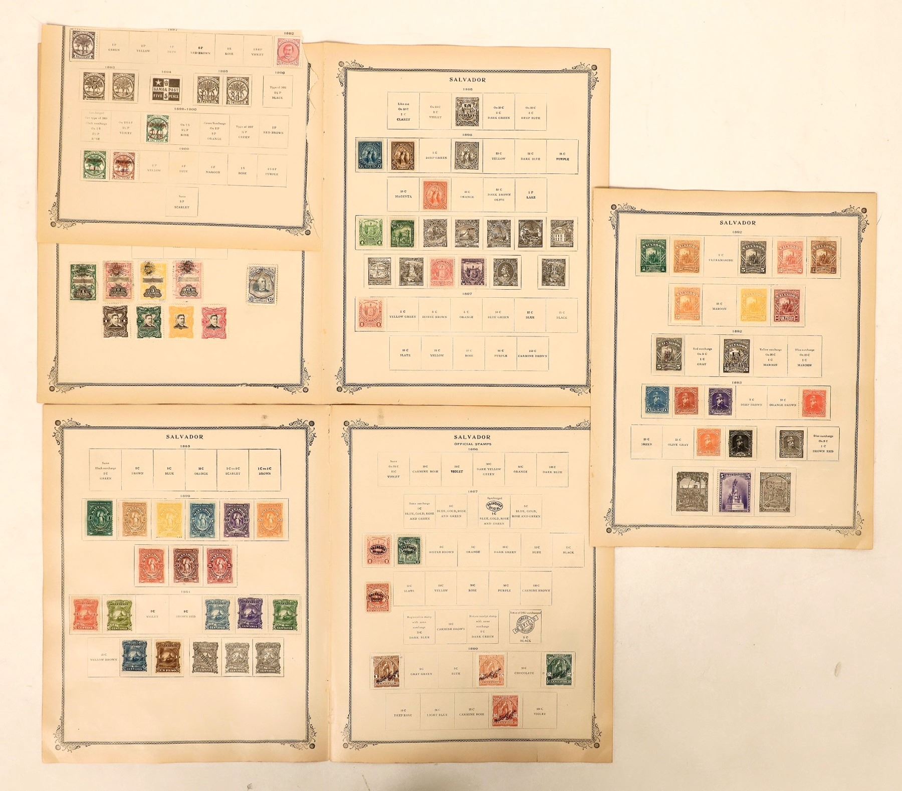 Collection of over 100 early postage stamps from Salvador, c1867-1900. Several off-center. Denominations- 1/2-50. Also, Samoa (5) half penny to 2 1/2 pence, 1887-1900.