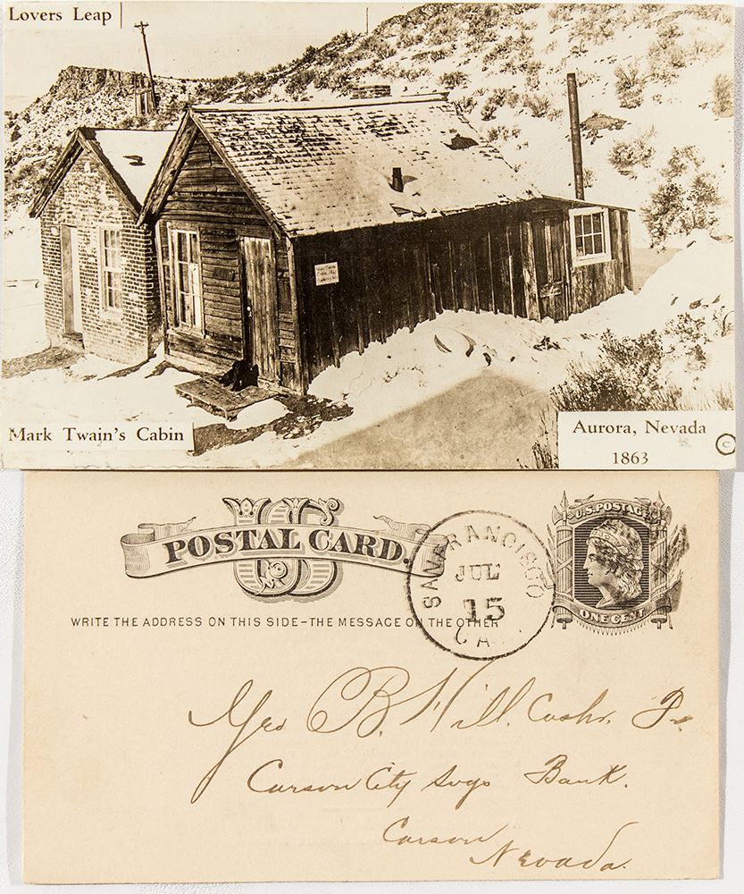 1) Postal card mailed in San Francisco to Geo. B. Hill, Carson City Savings Bank, informing him that at a stockholder meeting for the Jupiter Mining Co., an assessment was levied. Location of works: Bodie, California. SF cancel. 2) RPPC of Mark Twain's cabin in Aurora, Nevada. Bend upper righthand corner.
